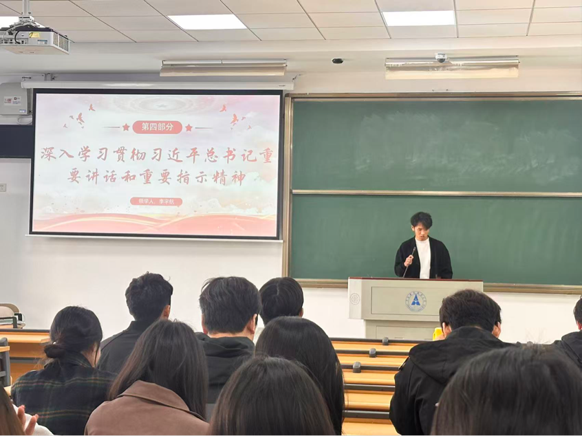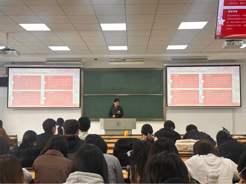 任诗雨同学以《中国共产党思想政治工作条例》为核心开展专题领学。从指导思想、地位作用、根本任务、内容重点、方法路径、阵地建设、队伍建设、责任落实、保障监督九个方面,系统解读条例要求;结合“教育是国之大计、党之大计”的重要论断,强调党员要做到专业学习与思想武装并重、个人成长与服务国家结合,在集体中发挥模范带头作用。