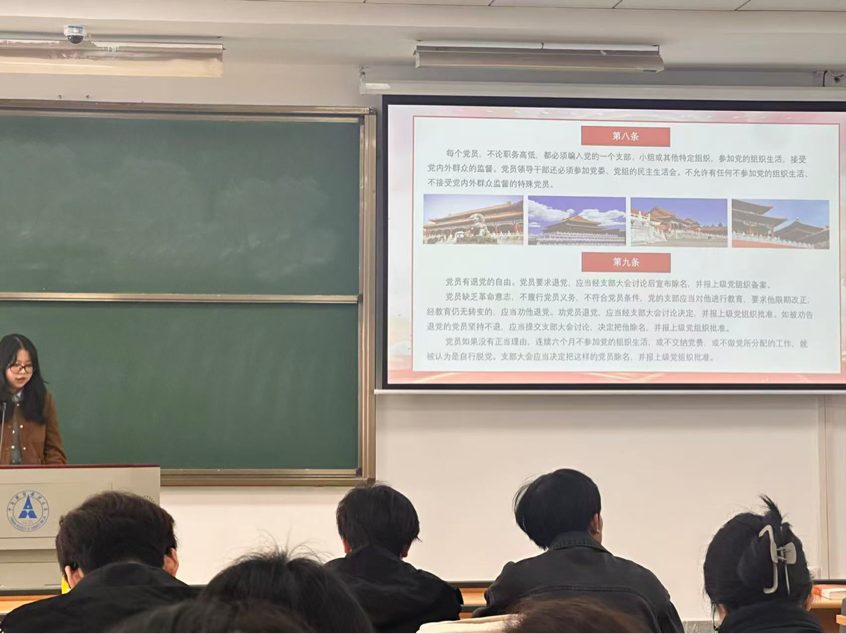 随后,在宋润田同学的带领下,大家集中学习《中国共产党章程》的第一章第六条至第九条,帮助支部成员清晰掌握党员权利义务与组织纪律,为规范自身行为、履行党员职责提供根本遵循。