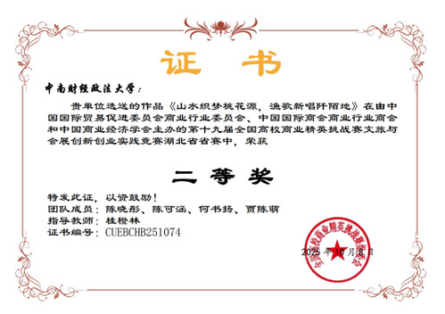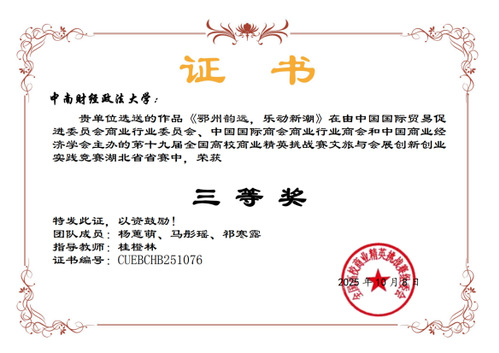 由我院桂橙林副教授指导的五个团队分别斩获湖北省省赛一二三等奖。王臻、肖洁、宋磊琪团队,陈诗睿、江妍孟、刘雨涵、朱娅萱、梁兴风团队荣获湖北省一等奖,陈晓彤、陈可涵、何书扬、贾陈萌团队荣获湖北省二等奖,杨蕙萌、马彤瑶、祁寒露团队,刘昕怡、唐欣、邱诗妍、董芷珊、李涵栎团队荣获湖北省三等奖。
