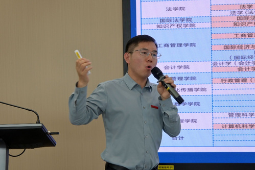 为使汉铁高中师生进一步了解我校,来自不同学院的五位优秀学生代表进行了所学专业介绍。来自统计与数学学院的龚开介绍了金融经济与数理统计的关联,鼓励工科思维活跃且向往金融事业的同学报考我校;作为毕业于汉铁高中的师姐,潘若欣聚焦“专业新、活动多、灵活度高”三大特点,从会计学院财务管理与人工智能双学位学生的角度分享了自己的大学生活。