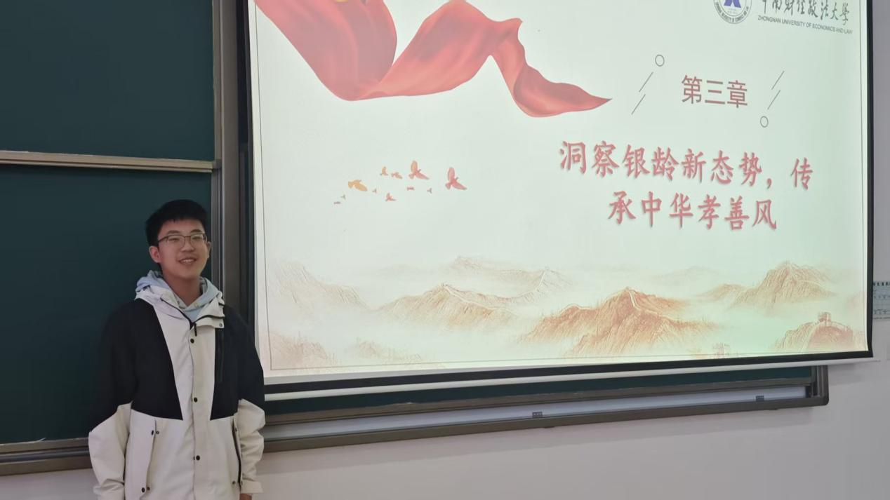 在孝善文化环节,文思铭同学先宣讲了国家应对人口老龄化的基础政策,比如社区养老服务站的功能、老年人智能设备培训等,然后邀请团员分享身边的孝善故事真实的小事让在场的同学都很有共鸣