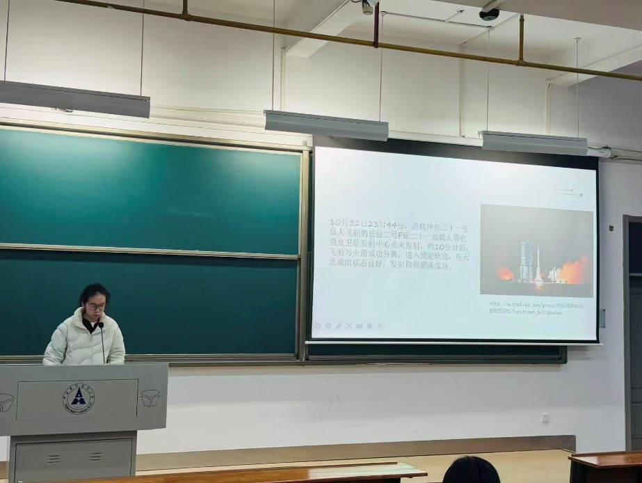 神舟逐梦探苍穹,直上九天揽星河。团支书高若茗同学组织观看了神舟二十一号载人飞船发射圆满成功的视频资料,共同回顾中国航天事业的辉煌成就。同学们为我国航天科技的飞速发展感到自豪,纷纷表示要学习航天人勇攀高峰、敢于追梦的奋斗精神。