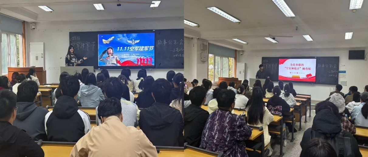 第二个子环节,11月11日空军建军节,在马佳乐的带领下开展了“空军建军节”故事会。张朔华同学讲述了“空军神炮手”鲍寿根的故事。他说,我们要感悟蓝天忠诚,汲取榜样力量,树立报国理想,肩负时代担当。