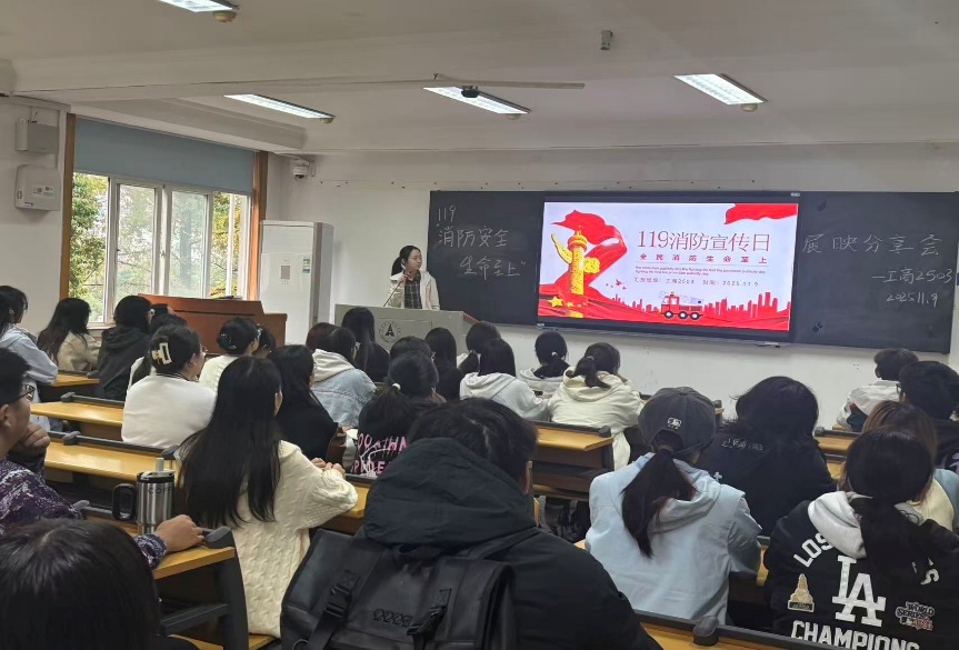 第一个子环节,11月9日消防宣传日,工商三班在蔡思羽同学的带领下成功开展了“119消防安全 生命至上”展映分享会。同学们谈到我们应该提升消防意识,掌握应急技能,共同守护我们宝贵的生命和校园安全。