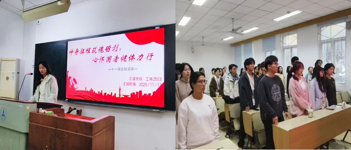 第三个子环节,11月13日,我们开展“神舟征程铸魂砺剑,心怀国家健体力行”主题团日线下班会。大会第一项齐唱团歌。班会在嘹亮的团歌声中正式拉开序幕。激昂的旋律回荡全场,瞬间点燃了同学们的青春热忱与集体荣誉感,也为本次主题活动奠定了庄重而热烈的基调。