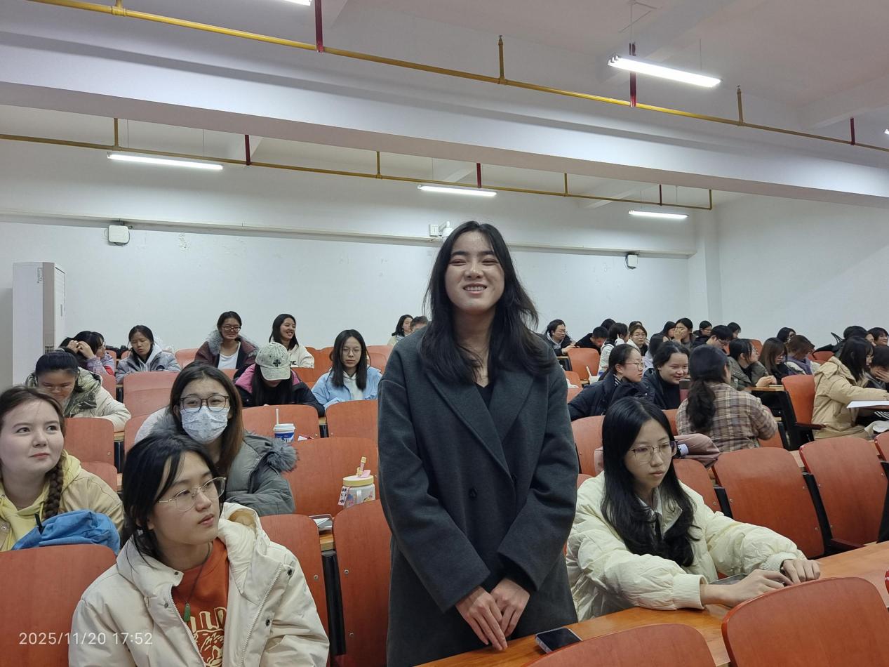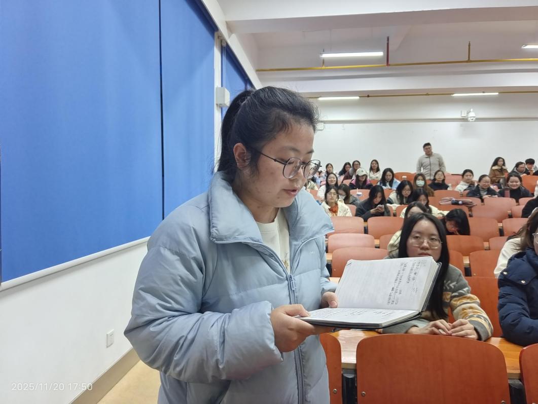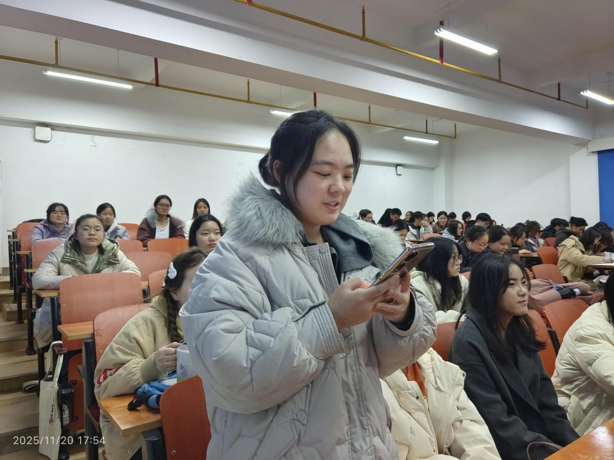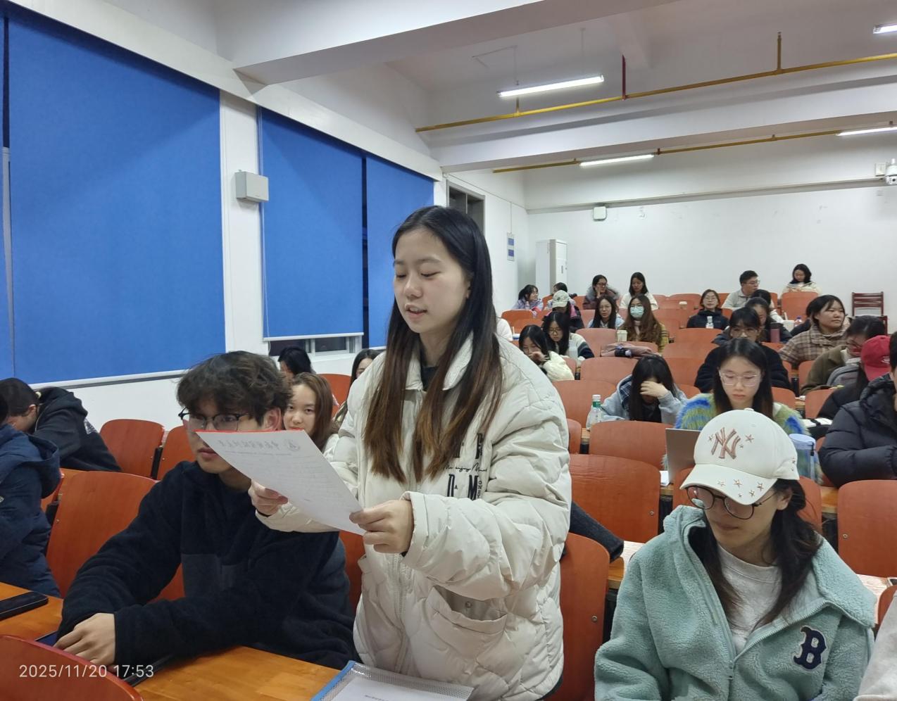 经济贸易本科生第二党支部的代表则结合“从毛泽东诗词中学党史”专题党课分享学习心得。她指出,‘雄关漫道真如铁’到‘人间正道是沧桑’,毛泽东诗词是党史的生动载体,也是共产党人精神谱系的不朽丰碑。作为青年党员,我们要从中汲取精神养分,为推进中国式现代化注入青春能量。