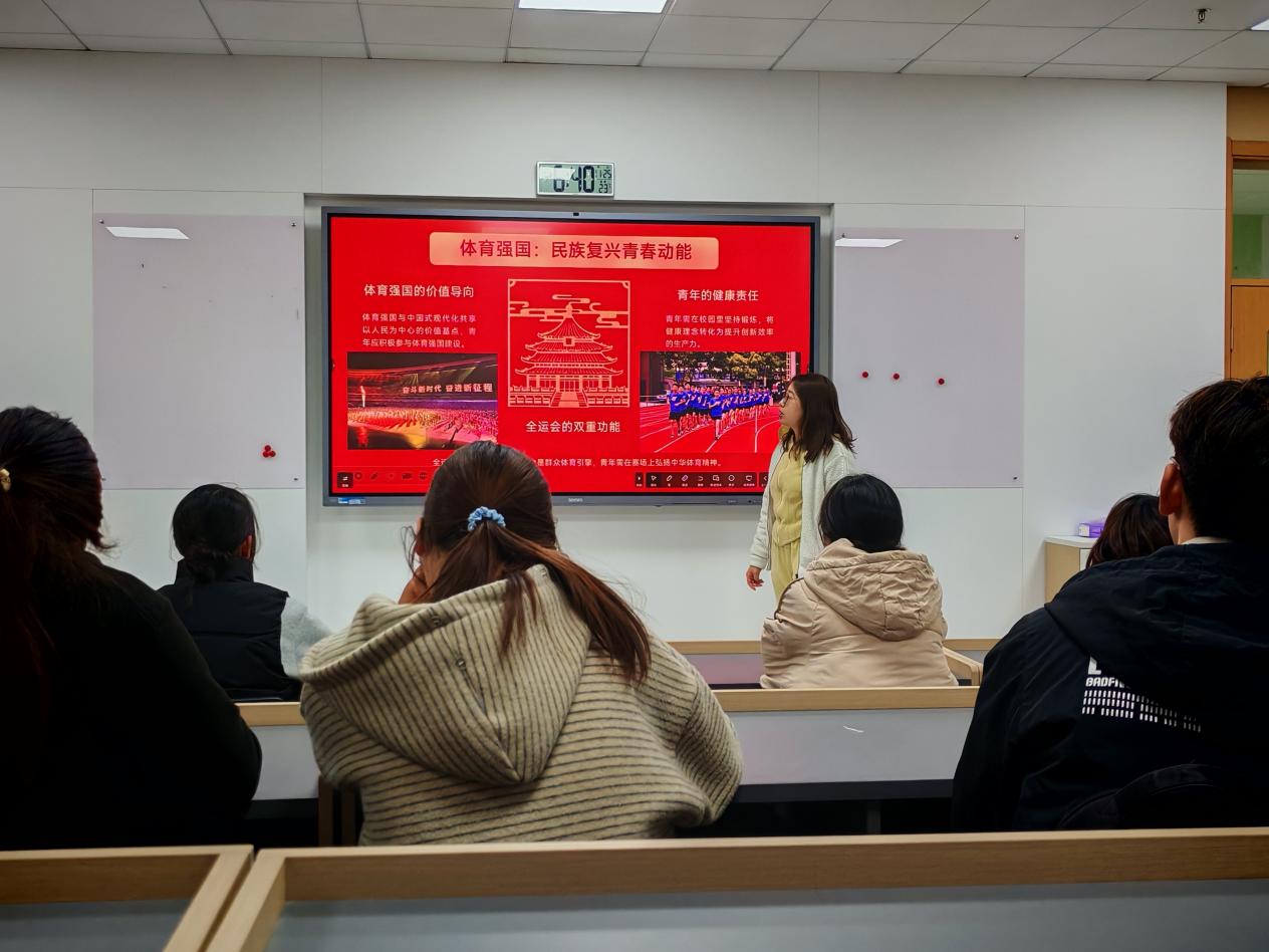 跃动青春绽华彩,同心奋进绘新篇。活动第五项,宣扬体育精神。体育强则中国强,国运兴则体育兴。中华人民共和国第十五届运动会于2025年11月9日至21日在粤港澳三地举行,李佳欣向同学们讲解了体育运动对个人、对社会、对国家的积极作用,鼓励青年要广泛参与体育运动之中,文明其精神,野蛮其体魄,这样才能更好地担当时代重任,为民族复兴贡献青春力量。