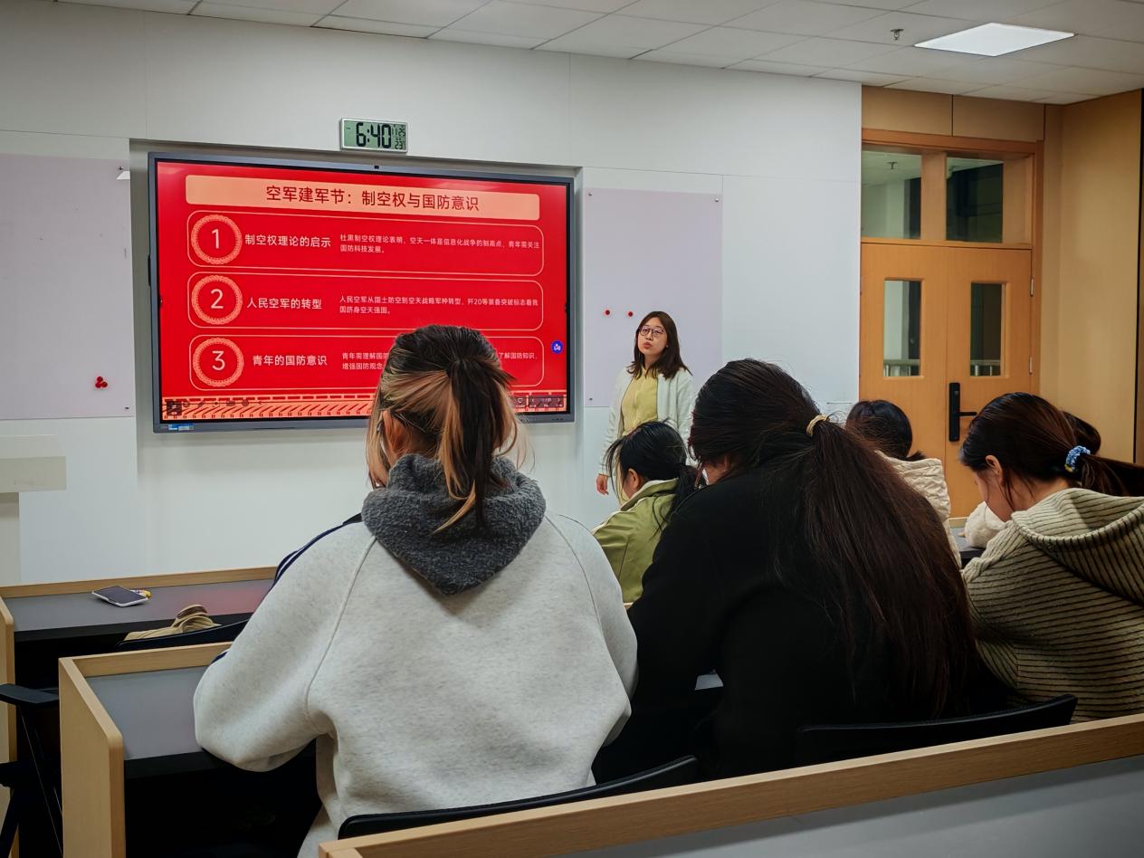 活动第六项,牢记国防使命,传承空军精神。2025年11月11日,是第76个空军建军节。李佳欣为大家讲解了制空权与国防意识,广大团员青年应增强国家安全观念,把个人理想与国家安危紧密相连,以青春之力守护蓝天净土、筑牢国防长城。