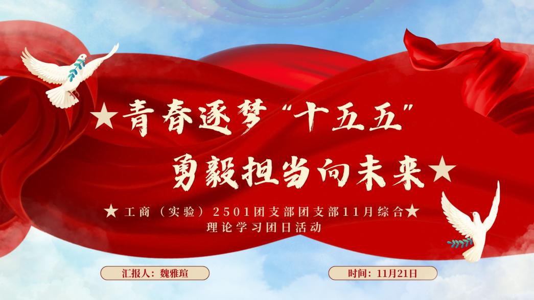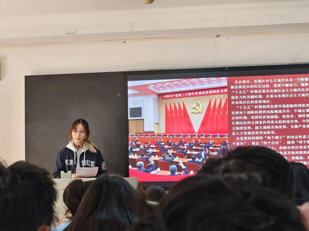 会议伊始,团支书带领大家回顾了中国共产党第二十届中央委员会第四次全体会议的重要内容。通过展示会议中提出对“十五五”时期经济社会发展的主要目标和主要任务。 全体成员均表示,作为新时代青年须与时代同频共振,与时代共舞,筑时代华章,以实际行动为实现强国目标做贡献。