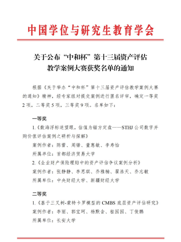 “中和杯”资产评估教学案例大赛由中国学位与研究生教育学会主办,全国资产评估专业学位研究生教育指导委员会提供学术指导,中国资产评估协会支持,中和资产评估有限公司协办,是资产评估领域影响力广泛、专业性强的赛事之一。赛事自2013年创办以来,已连续举办十三届,对推动高质量教学案例开发与应用、提升资产评估专业学位研究生的创新实践能力发挥了重要作用。此次获奖充分展现了我院在资产评估人才培养、案例教学创新及学术实践能力建设方面的实力与成果。学院将继续深化教学模式改革,积极打造高水平案例成果,推动专业教育高质量发展。