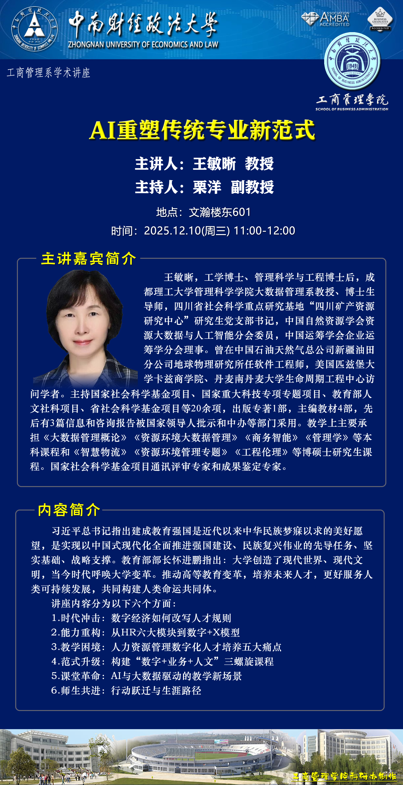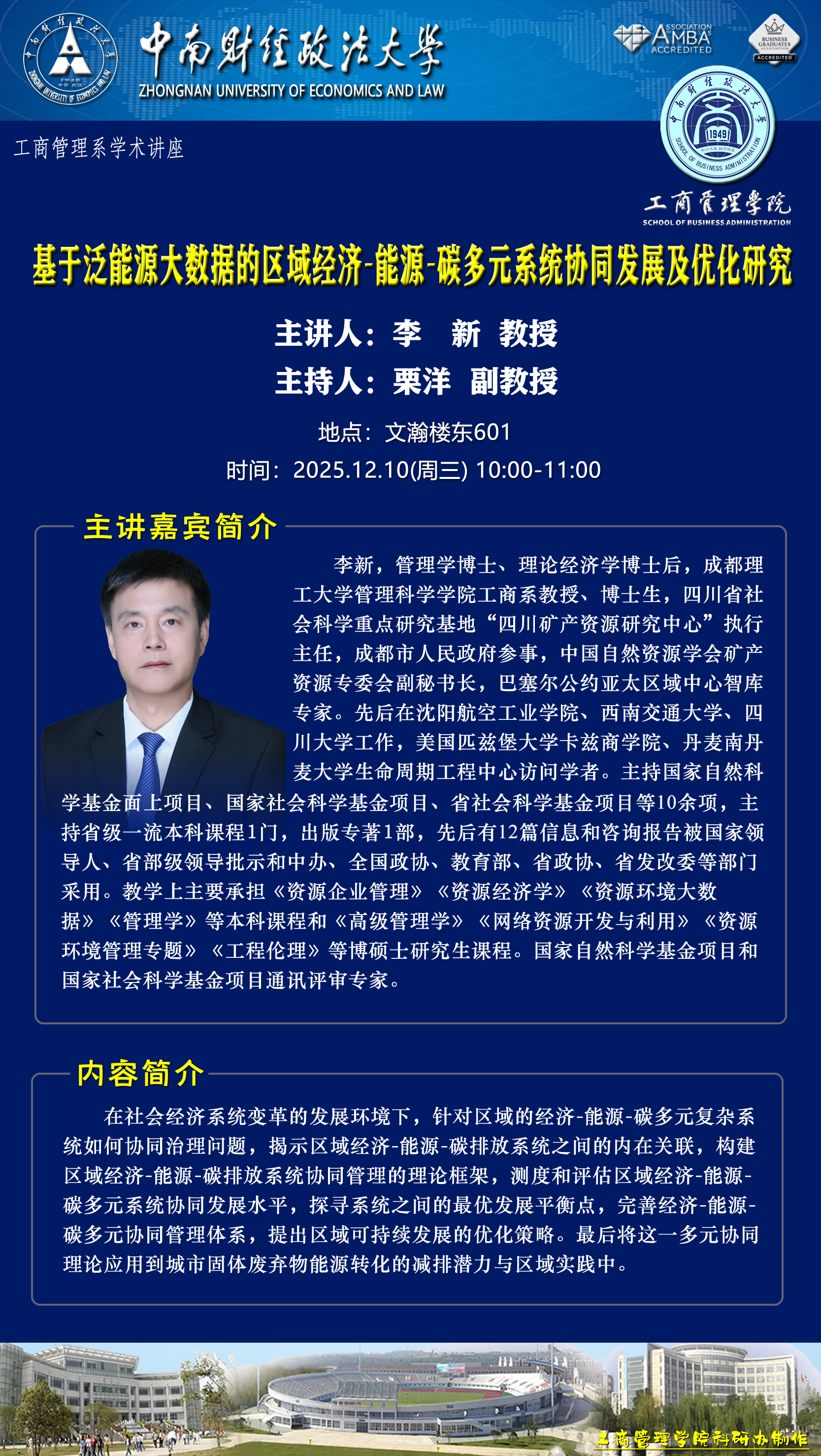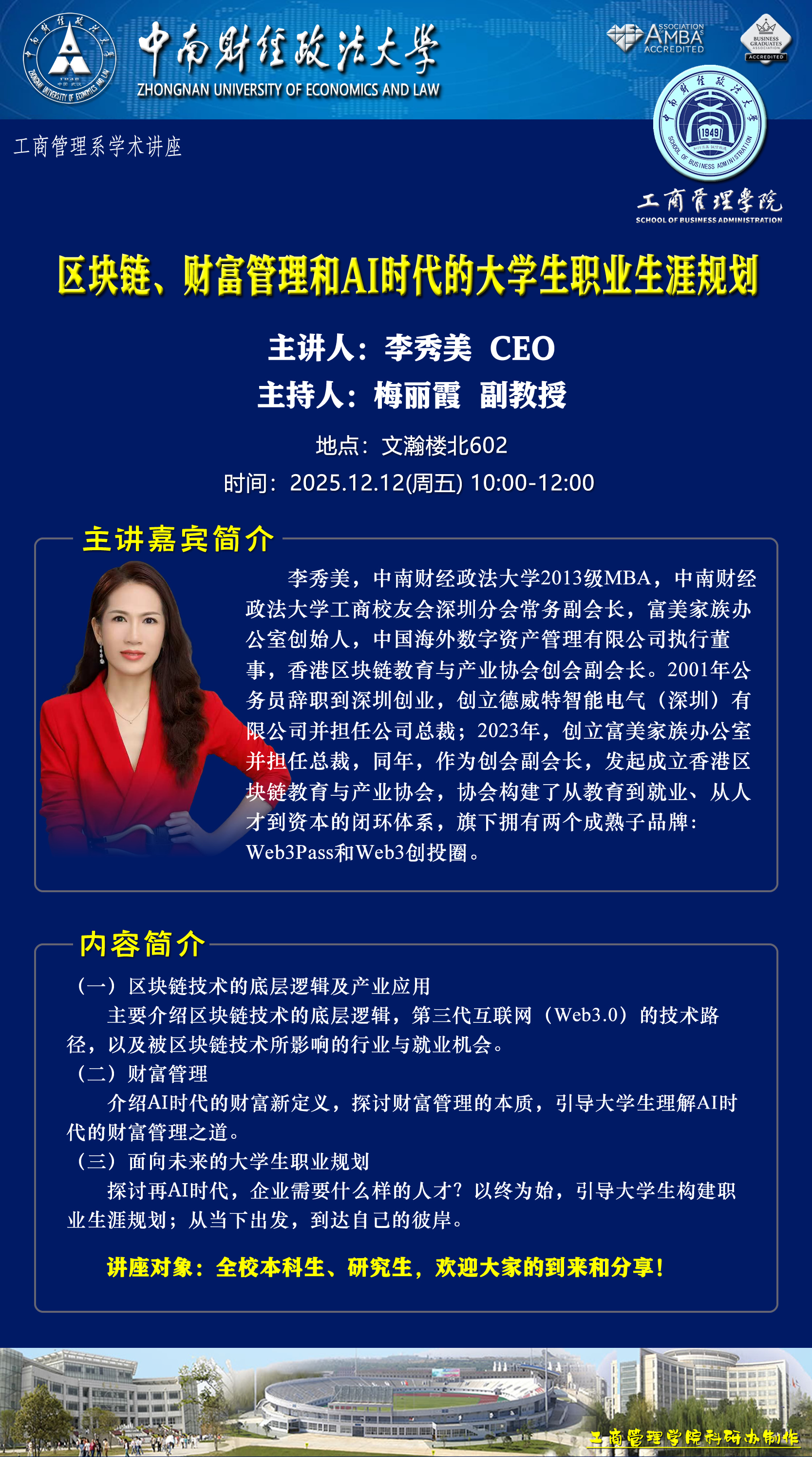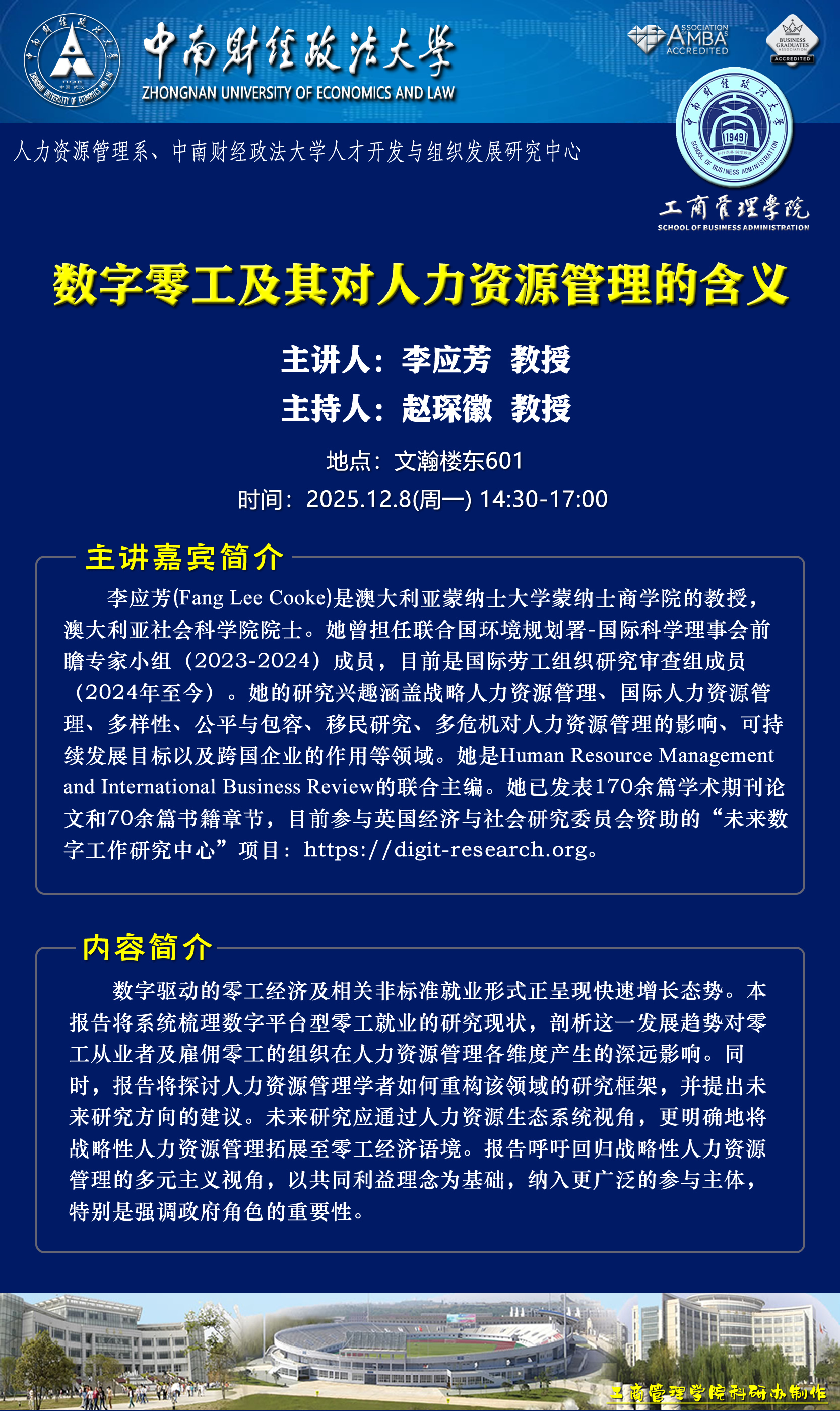 时间地点主办单位主持人主讲人主题2025.12.08 14:30-17:00文瀚楼东601人力资源管理系中南大人才开发与组织发展研究中心赵琛徽 教授李应芳 教授数字零工及其对人力资源管理的含义2025.12.10 10:00-11:00文瀚楼东601工商管理系栗洋 副教授李新 教授基于泛能源大数据的区域经济-能源-碳多元系统协同发展及优化研究2025.12.10 11:00-12:00文瀚楼东601工商管理系栗洋 副教授王敏晰 教授AI重塑传统专业新范式2025.12.12 10:00-12:00文瀚楼北602工商管理系梅丽霞 副教授李秀美 CEO区块链、财富管理和AI时代的大学生职业生涯规划