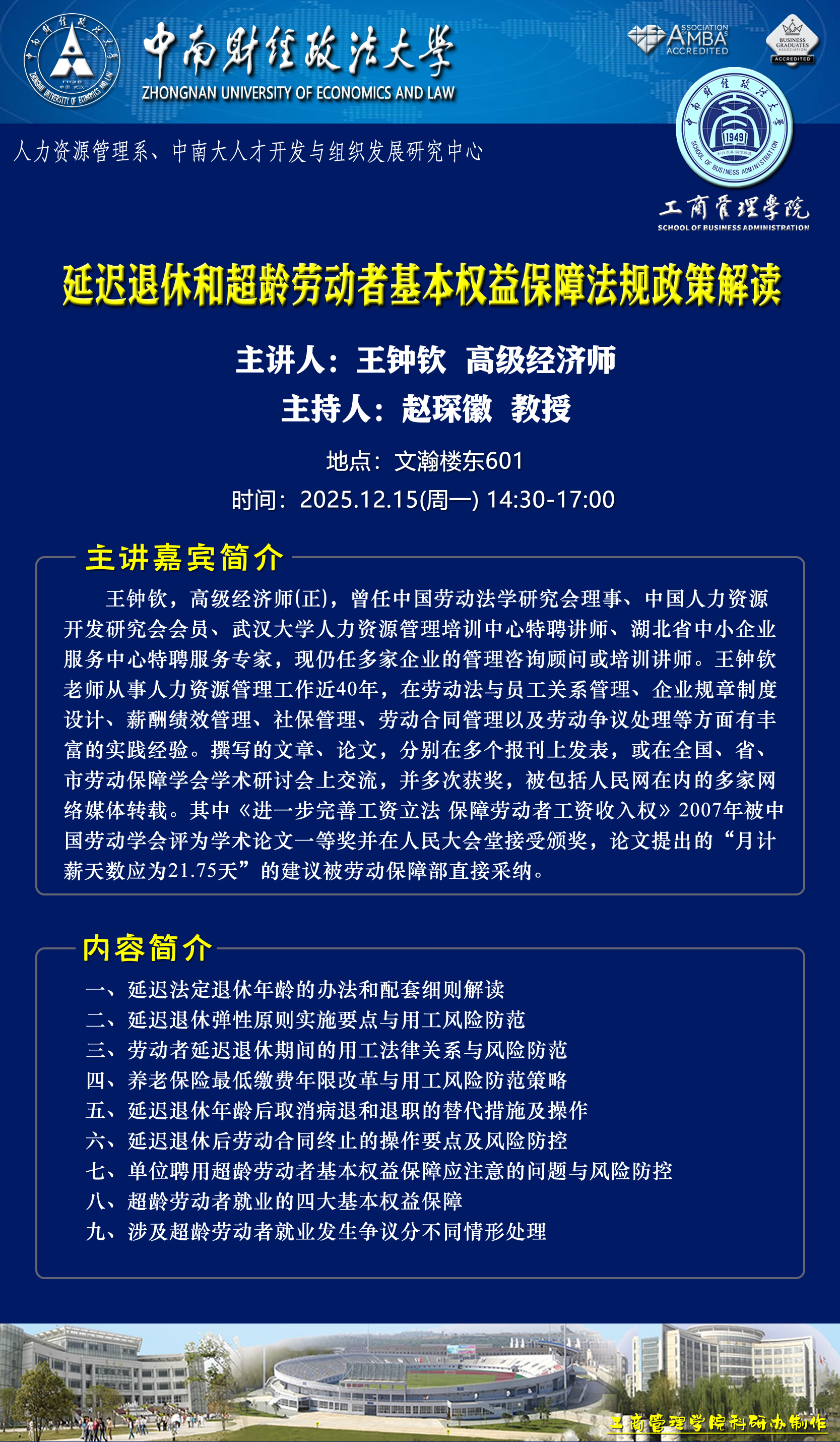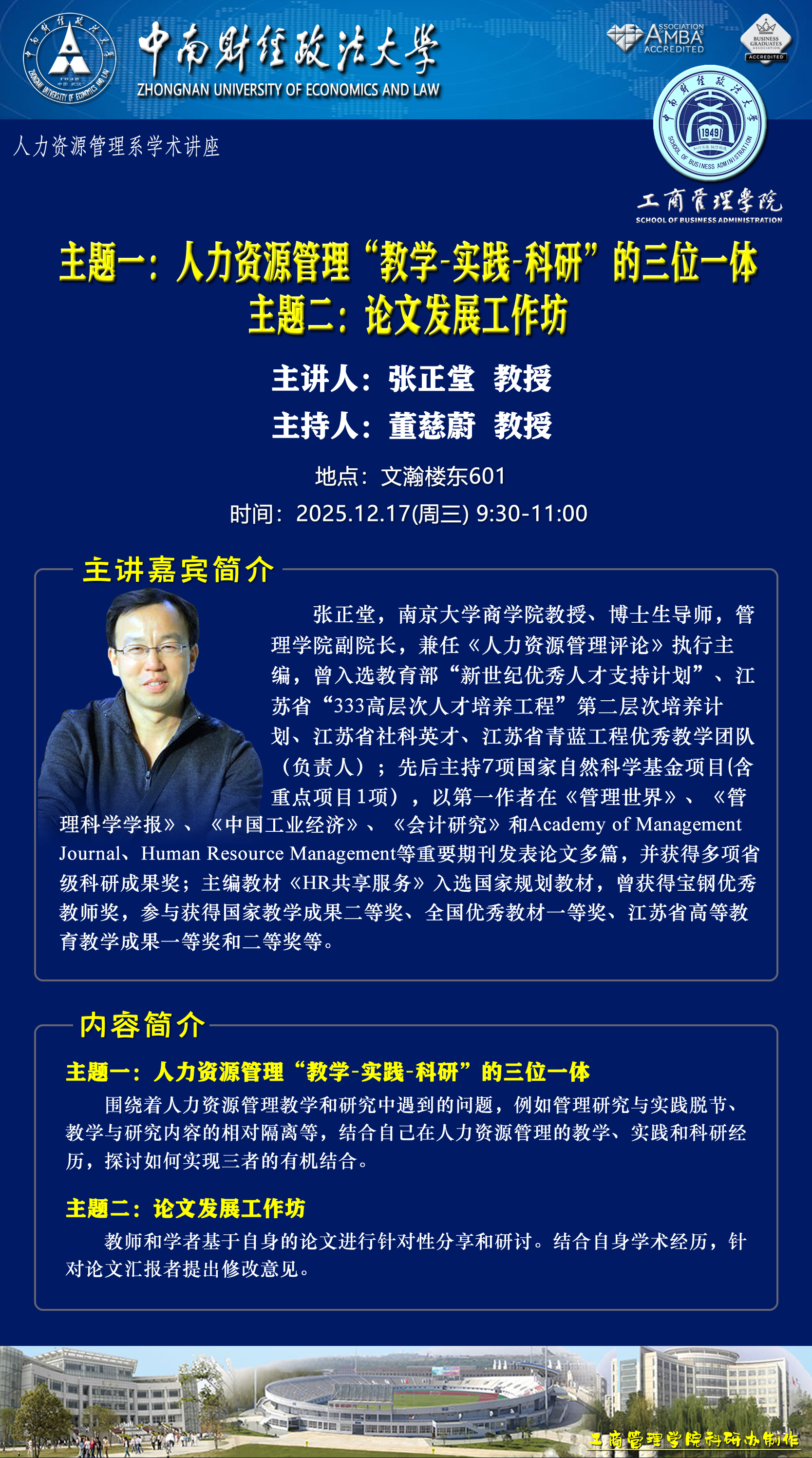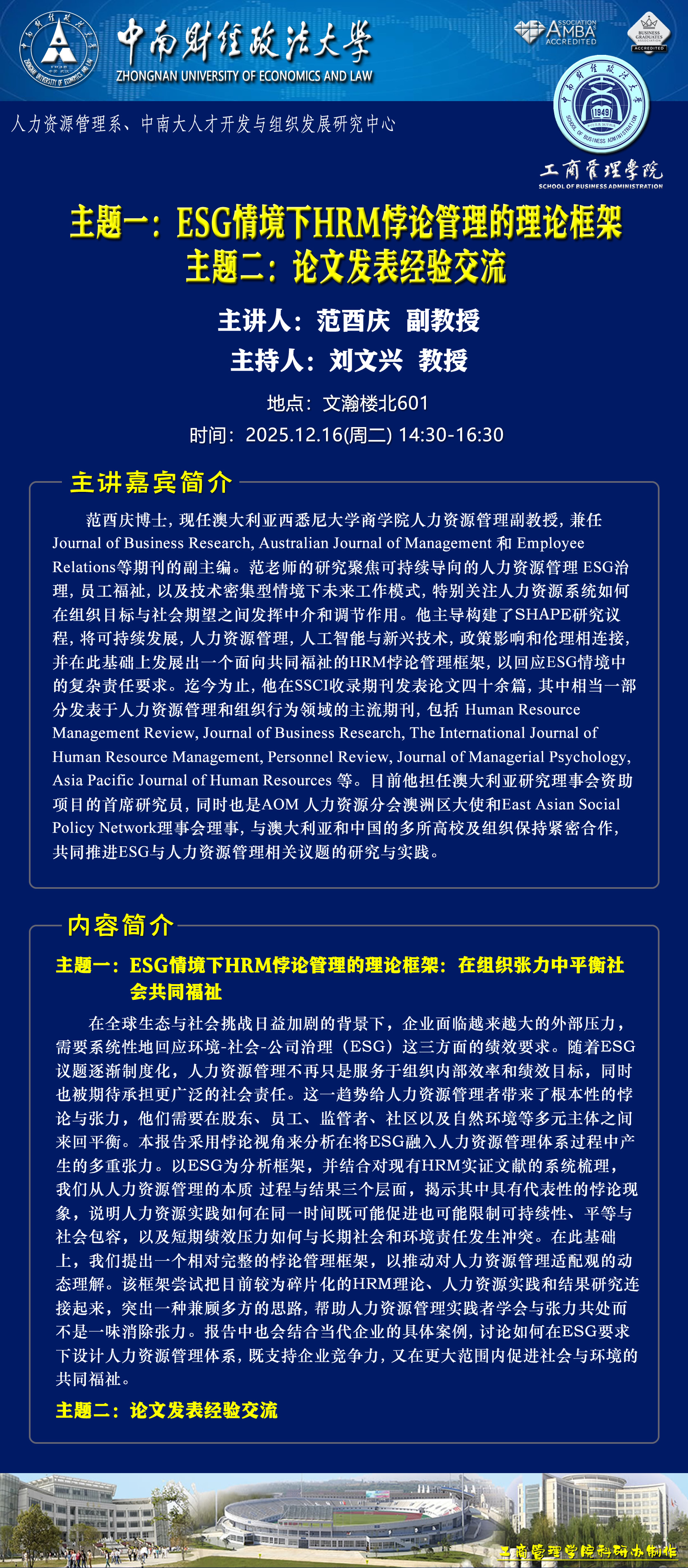 时间地点主办单位主持人主讲人主题2025.12.15 14:30-17:00文瀚楼东601人力资源管理系赵琛徽 教授王钟钦 高级经济师延迟退休和超龄劳动者基本权益保障法规政策解读2025.12.16 14:30-16:30文瀚楼北601人力资源管理系刘文兴 教授范酉庆 副教授主题一:ESG情境下HRM悖论管理的理论框架: 在组织张力中平衡社会共同福祉主题二:论文发表经验交流2025.12.17 9:30-11:00文瀚楼东601人力资源管理系董慈蔚 教授张正堂 教授主题一:人力资源管理“教学-实践-科研”的三位一体主题二:论文发展工作坊2025.12.17 11:00-12:30文瀚楼东601工商管理系赵君 教授赵君 教授主题一:从技术鸿沟到技术追赶:数字经济发展效应主题二:论文发展工作坊2025.12.18 14:00-16:00文瀚楼北603人力资源管理系湖北国资国企改革发展研究中心刘文兴 教授陈扬 教授主题一:事件系统理论——现象驱动研究,成果反哺实践主题二:项目申请经验交流2025.12.18 15:00-17:00文瀚楼东601工商管理系赵君 教授张伟 投资顾问资本市场改革与企业创新发展