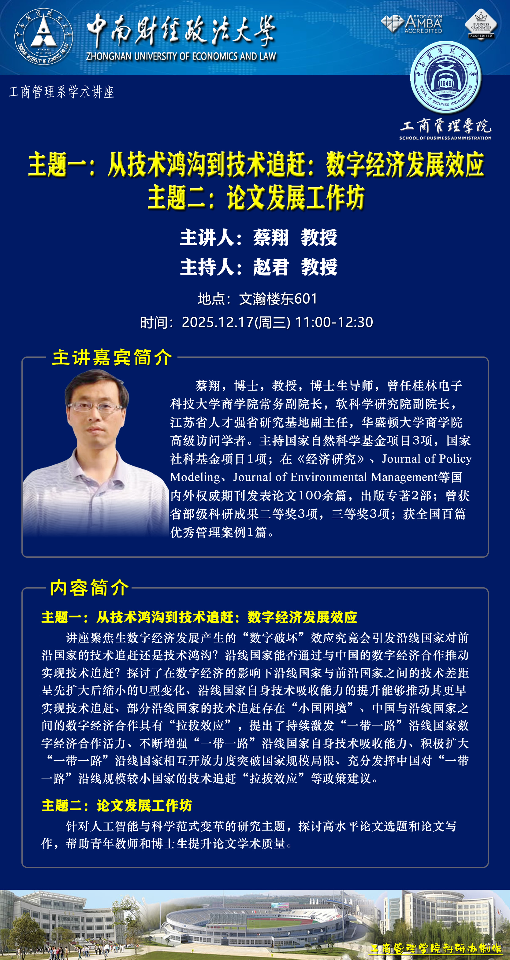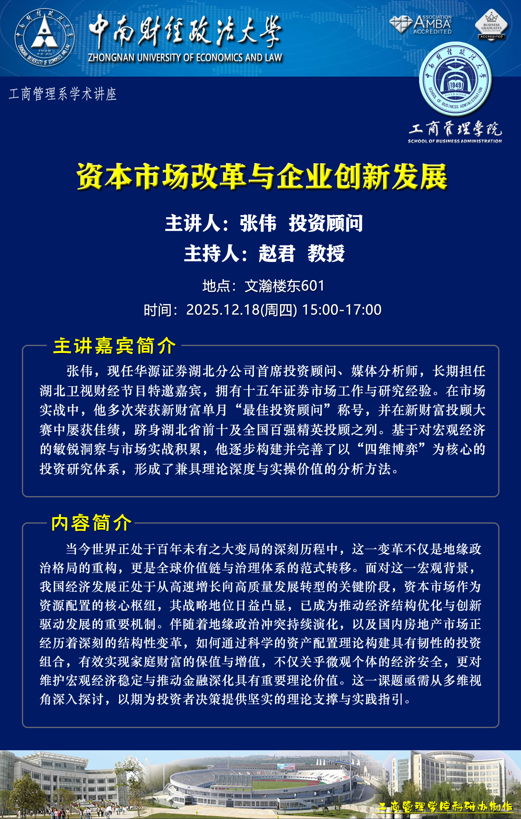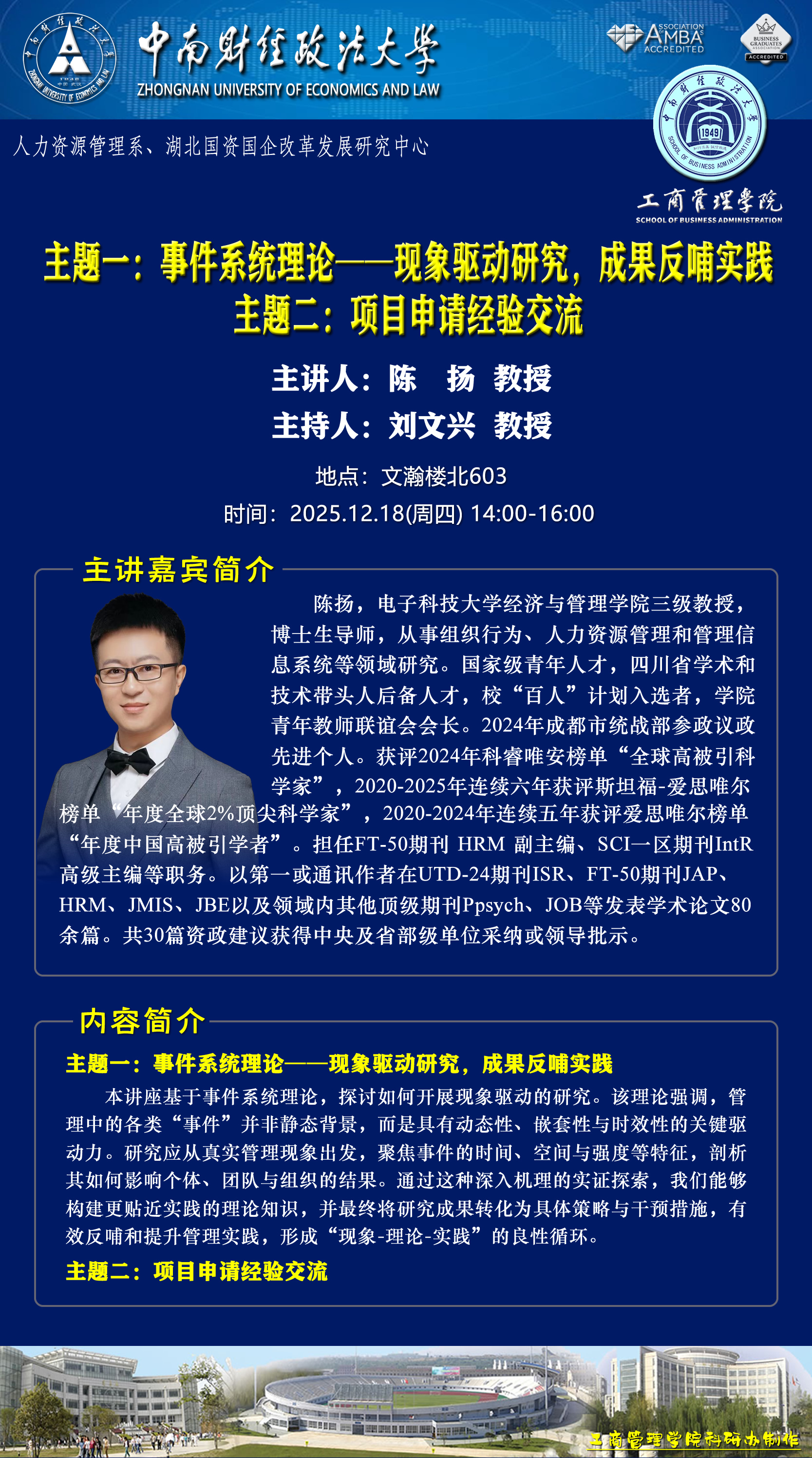 时间地点主办单位主持人主讲人主题2025.12.15 14:30-17:00文瀚楼东601人力资源管理系赵琛徽 教授王钟钦 高级经济师延迟退休和超龄劳动者基本权益保障法规政策解读2025.12.16 14:30-16:30文瀚楼北601人力资源管理系刘文兴 教授范酉庆 副教授主题一:ESG情境下HRM悖论管理的理论框架: 在组织张力中平衡社会共同福祉主题二:论文发表经验交流2025.12.17 9:30-11:00文瀚楼东601人力资源管理系董慈蔚 教授张正堂 教授主题一:人力资源管理“教学-实践-科研”的三位一体主题二:论文发展工作坊2025.12.17 11:00-12:30文瀚楼东601工商管理系赵君 教授赵君 教授主题一:从技术鸿沟到技术追赶:数字经济发展效应主题二:论文发展工作坊2025.12.18 14:00-16:00文瀚楼北603人力资源管理系湖北国资国企改革发展研究中心刘文兴 教授陈扬 教授主题一:事件系统理论——现象驱动研究,成果反哺实践主题二:项目申请经验交流2025.12.18 15:00-17:00文瀚楼东601工商管理系赵君 教授张伟 投资顾问资本市场改革与企业创新发展