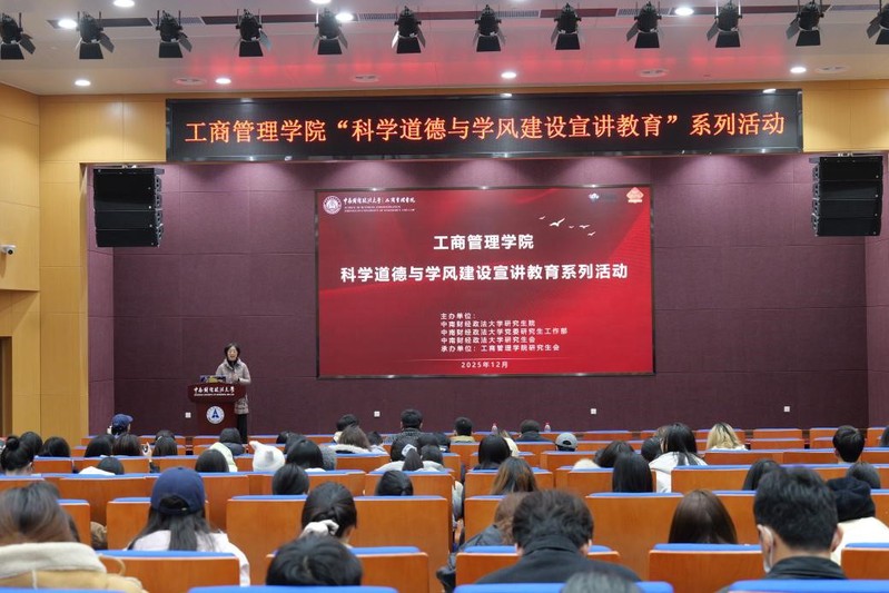 (通讯员:莫秀娥;摄影:白城玮)为进一步筑牢学生学术道德根基,弘扬求真务实的优良学风,营造风清气正的学术生态,2025年12月12日18:30,由中南财经政法大学研究生院、党委研究生工作部、中南财经政法大学研究生会主办,中南财经政法大学工商管理学院研究生会承办的研究生“科学道德与学风建设宣讲教育”系列活动在文瀚楼南报告厅顺利举办。本次活动特邀《华中科技大学学报(社会科学版)》编辑部主任、常务副主编,硕士研究生导师吴兰丽教授担任主讲嘉宾。工商管理学院党委副书记、纪委书记兼行政副院长葛明老师出席本次活动,2025级全体硕士研究生参与,现场气氛热烈。