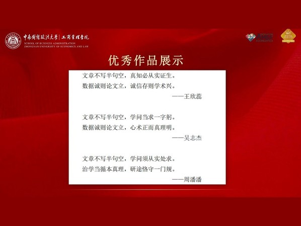 随后,活动进入知识竞答环节。同学们通过线上平台踊跃答题,在答题中进一步巩固讲座所传达的科学道德及学术规范要点。根据最终得分,现场评选出一、二、三等奖若干名。竞答环节结束后,活动进入“格言新说”创意接龙作品展示阶段。该环节是工商管理学院“科学道德与学风建设宣讲教育”系列活动的重要组成部分,前期已完成作品征集与评审工作,现场集中展示了从中遴选出的优秀作品,体现了同学们对科学道德与学风建设的创新思考。