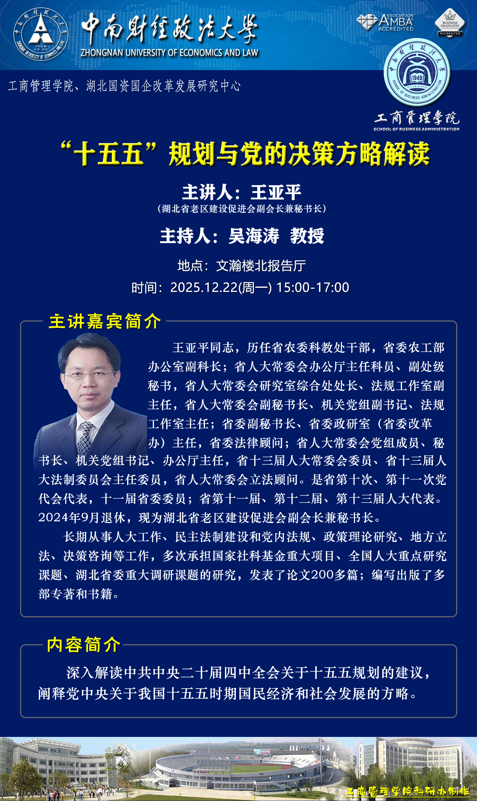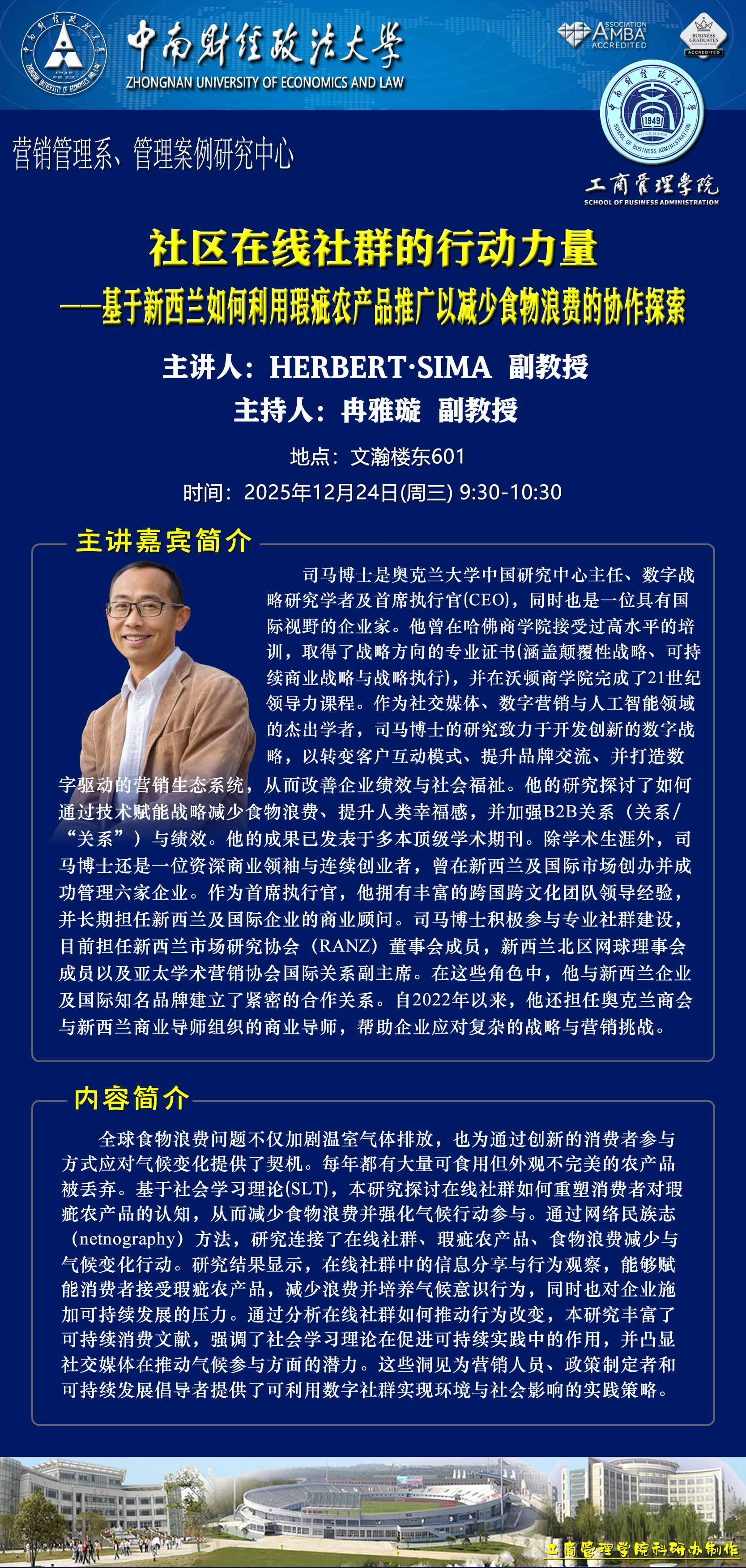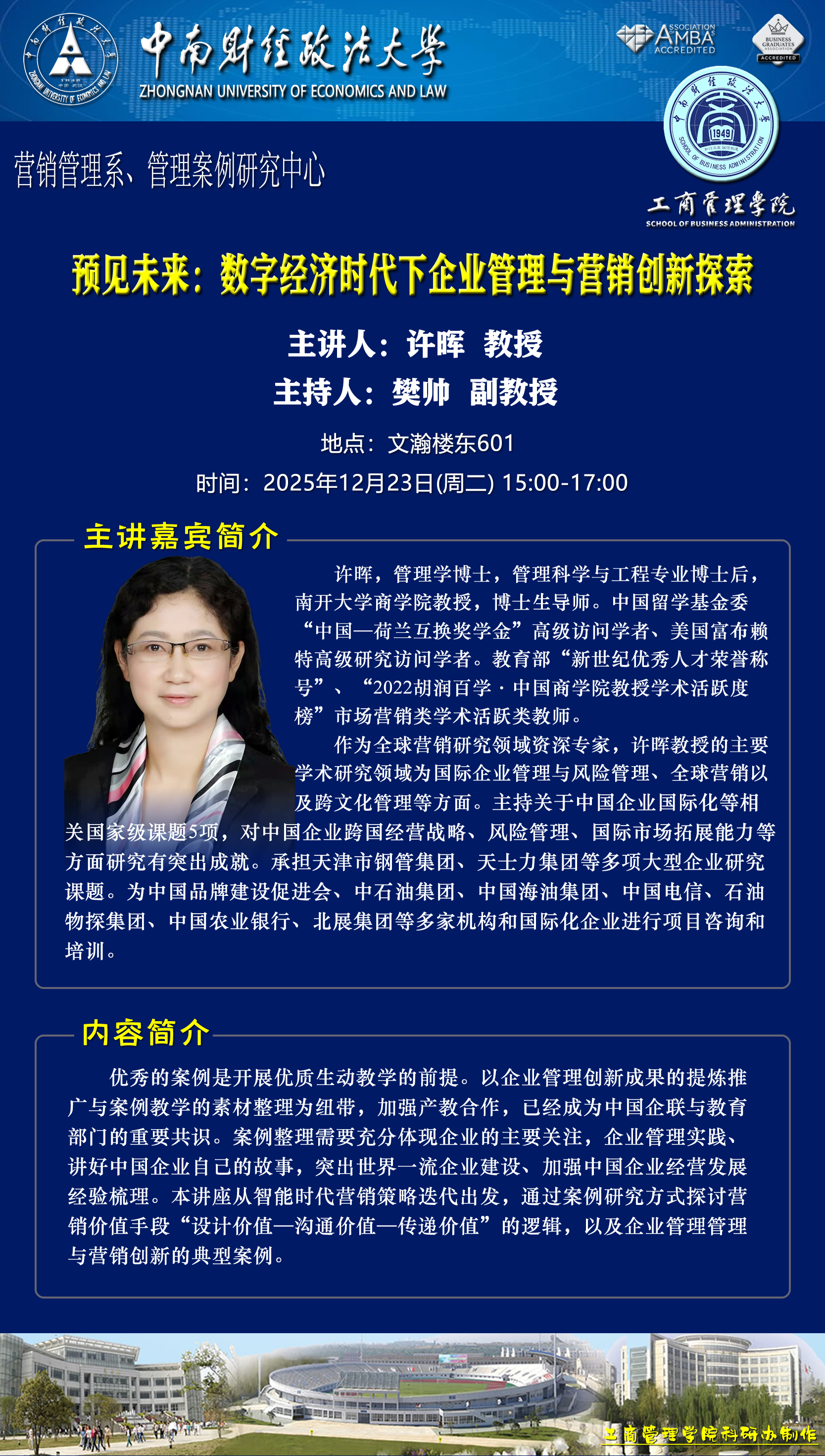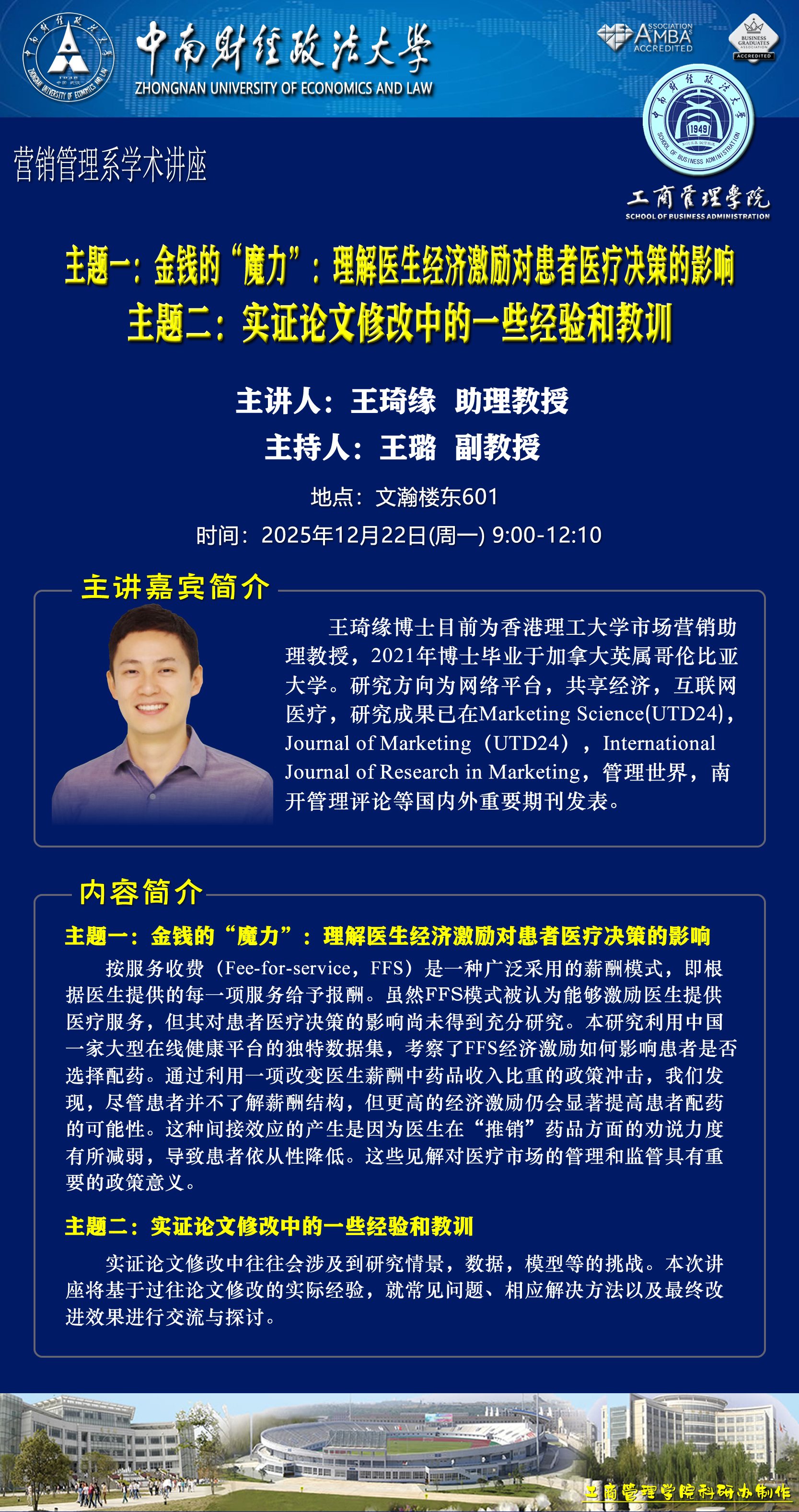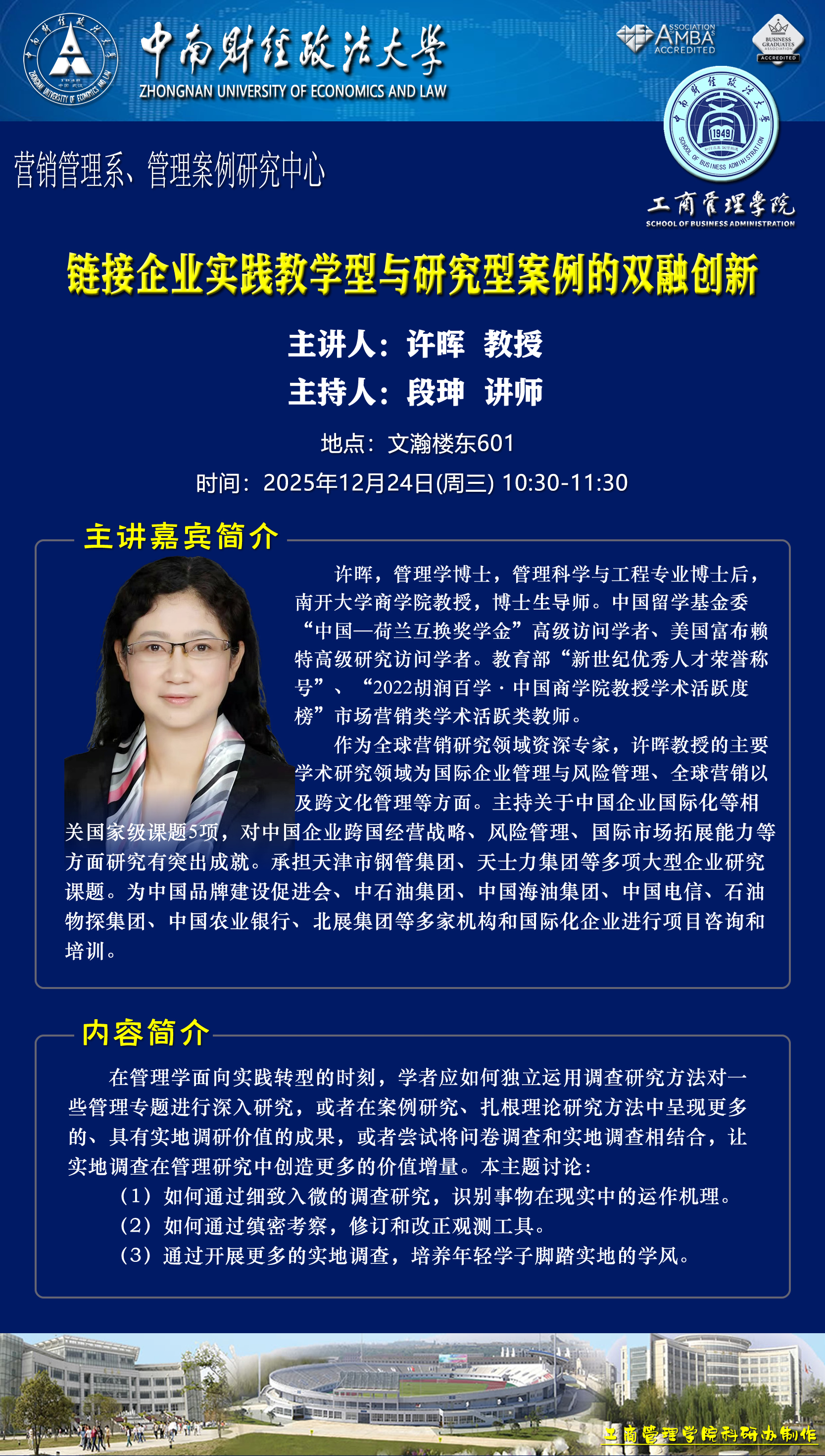 时间地点主办单位主持人主讲人主题2025.12.22 9:00-12:10文瀚楼东601营销管理系王璐 副教授王琦缘 助理教授主题一:金钱的“魔力”:理解医生经济激励对患者医疗决策的影响主题二:实证论文修改中的一些经验和教训2025.12.22 15:00-17:00文瀚楼北报告厅工商管理学院湖北国资国企改革发展研究中心吴海涛 教授王亚平 湖北省老区建设促进会副会长兼秘书长“十五五”规划与党的决策方略解读2025.12.23 10:00-12:00文瀚楼东601营销管理系、管理案例研究中心杜鹏 教授HERBERT·SIMA 副教授以团队为基础的教学方法研讨2025.12.23 15:00-17:00文瀚楼东601营销管理系、管理案例研究中心樊帅 副教授许晖 教授预见未来:数字经济时代下企业管理与营销创新探索2025.12.24 9:30-10:30文瀚楼东601营销管理系、管理案例研究中心冉雅璇 副教授HERBERT·SIMA 副教授社区在线社群的行动力量——基于新西兰如何利用瑕疵农产品推广以减少食物浪费的协作探索2025.12.24 10:30-11:30文瀚楼东601营销管理系、管理案例研究中心段珅 讲师许晖 教授链接企业实践教学型与研究型案例的双融创新