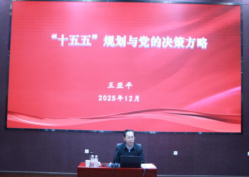 2025年12月22日下午,中南财经政法大学工商管理学院在文瀚楼北报告厅举办专题学习活动。湖北国资国企改革发展研究中心特邀湖北省老区建设促进会副会长兼秘书长、原省人大常委会秘书长王亚平主讲,以“十五五”规划与党的决策方略为题展开深度解读。活动由工商管理学院院长吴海涛主持,湖北国资国企改革发展研究中心主任文豪教授等百余名师生参加了学习活动。