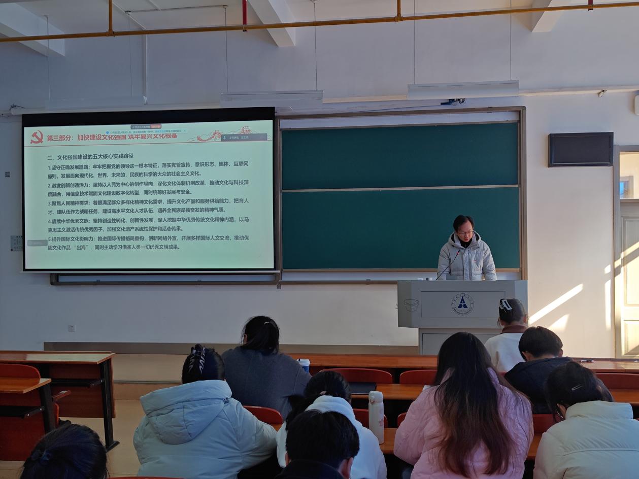 第三项学习由刘尚昆聚焦“加快建设文化强国 筑牢复兴文化根基”主题展开。领学人从战略定位切入,阐明了文化强国建设对中国式现代化、民族复兴和提升国际竞争力的重要意义,分析了当前文化建设的成就与短板,强调了锚定2035年建成文化强国目标的紧迫性。随后,围绕“坚守正确发展道路、激发创新创造活力、聚焦人民精神需求、赓续中华优秀文脉、提升国际文化影响力”五大核心实践路径,结合图示化解读,让支部成员清晰把握文化强国建设的具体方向。