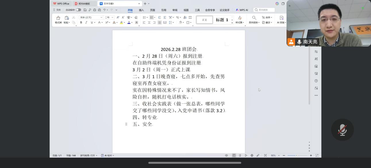 2月28日,2025级组织全体班团召开开学准备会议。辅导员刘筱佳、南天亮围绕新学期重点工作,着重强调学生报到注册、安全管理、学风建设等注意事项,并督促各位班团发挥纽带作用,协助同学们快速调整状态,投入新学期学习生活。