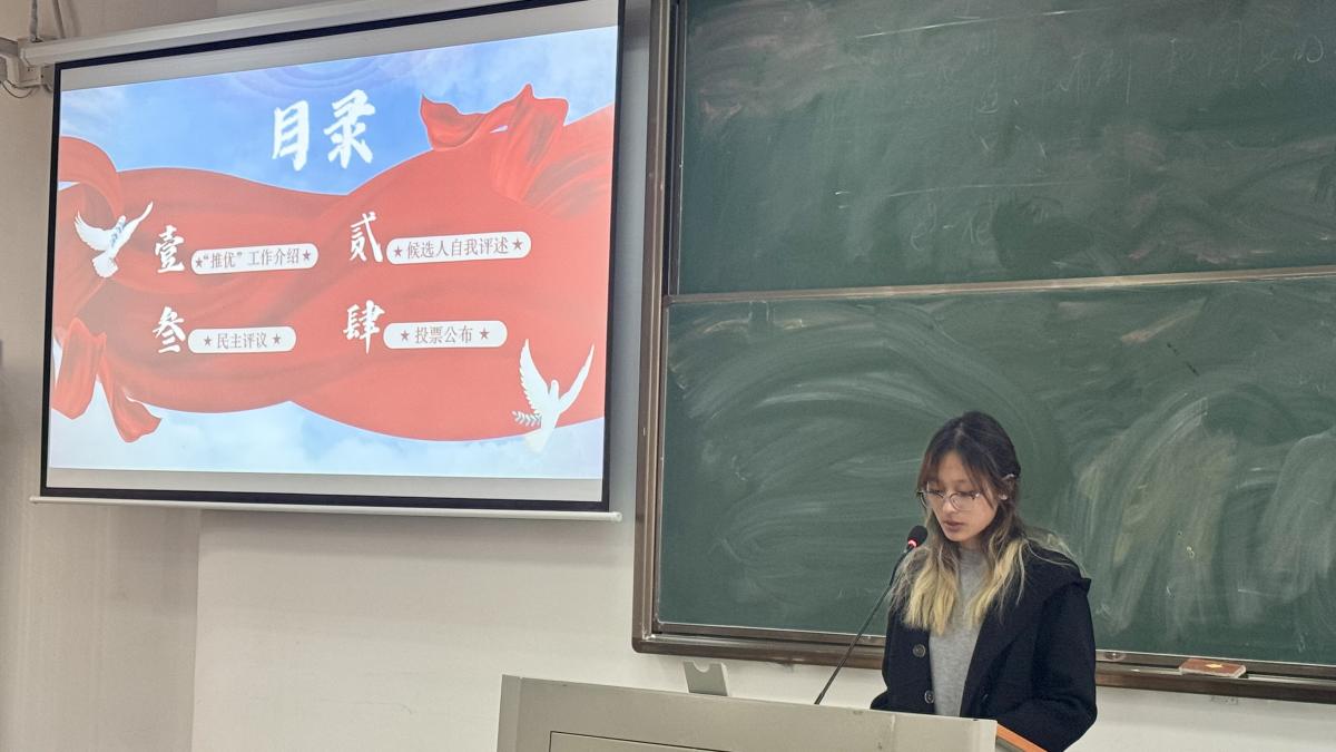 会议伊始,团支书魏雅瑄同学对此次“推优”工作进行了简单介绍。首先,团支书向支部各成员介绍了参加本次“推优”大会的候选人,然后她详细介绍了“推优”工作的实施总则以及实行条件,让在场的每位同学对本次”推优“工作心中有数。