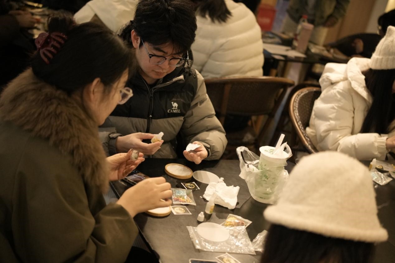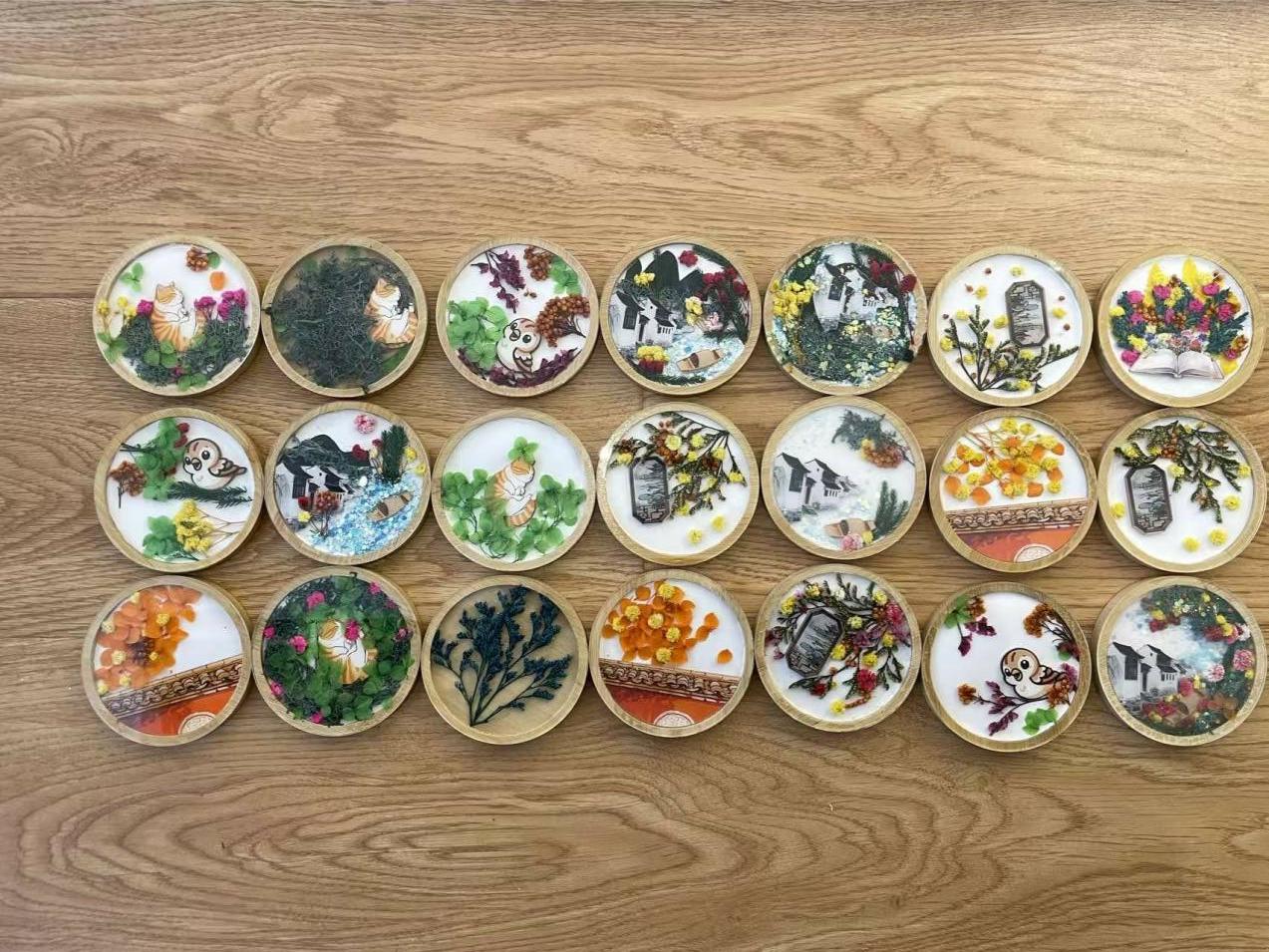 在轻松愉悦的氛围中,干花杯垫 DIY 创作正式开启。同学们根据个人审美与创意巧思,自主挑选缤纷多彩的干花素材、特色贴片,在白色卡纸上精心排布花材。
