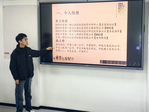 班会伊始何永禄师兄结合自身求职经历围绕实习选择、简历打磨、面试技巧、职业规划等同学们关心的话题展开细致分享。他结合旅游管理专业特色讲解就业优势与能力要求提醒大家夯实专业基础、积累实践经历、提升综合素养鼓励同学们找准定位、提前规划、勇敢尝试。