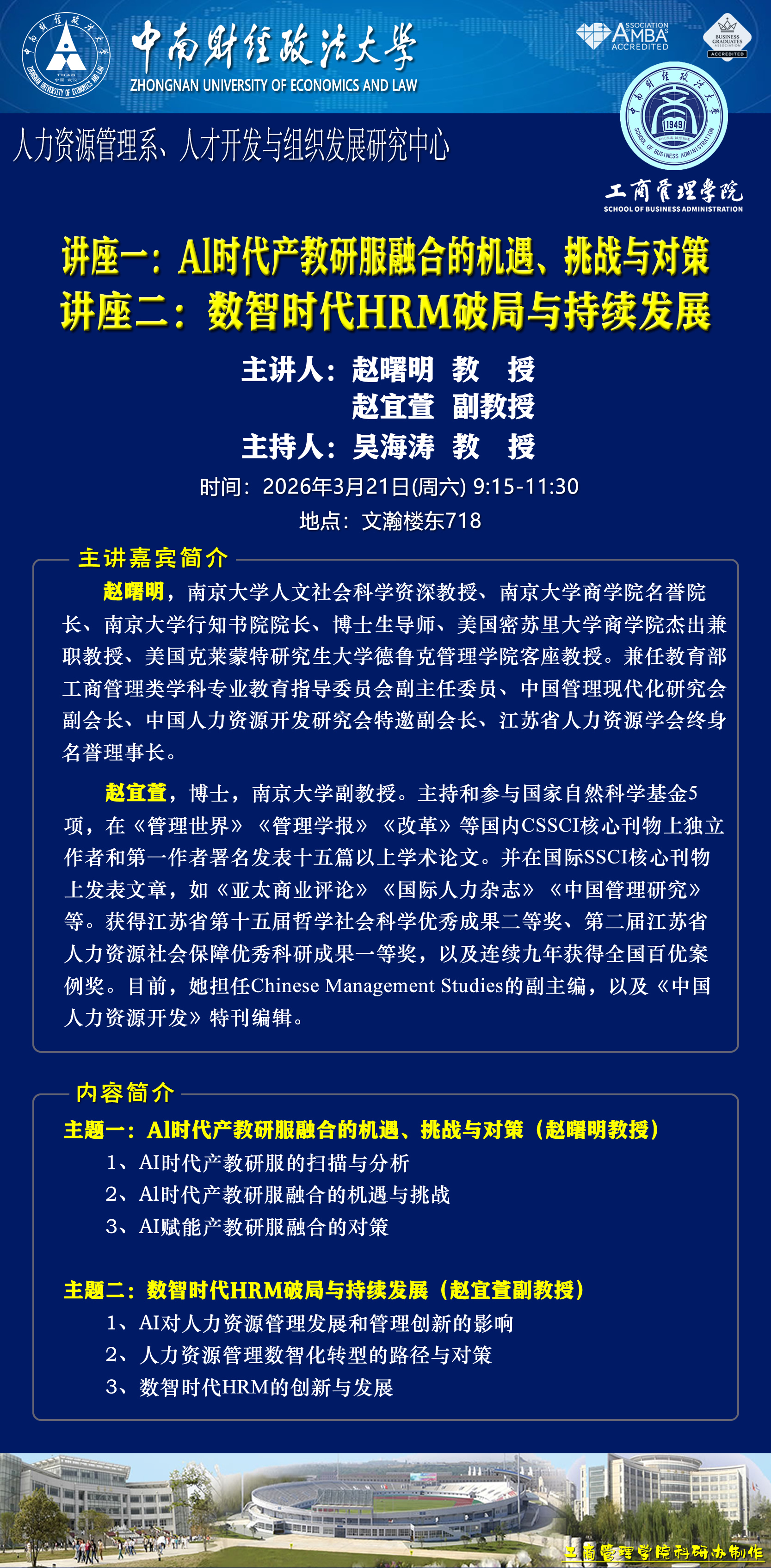 | 2026.03.21 9:15-11:30 | 文瀚楼东718 (原定文瀚楼东601变更) | 人力资源管理系 人才开发与组织发展研究中心 | 吴海涛 教授 | 赵曙明 教授 赵宜萱 副教授 | 主题一:Al时代产教研服融合的机遇、挑战与对策 主题二:数智时代HRM破局与持续发展 |