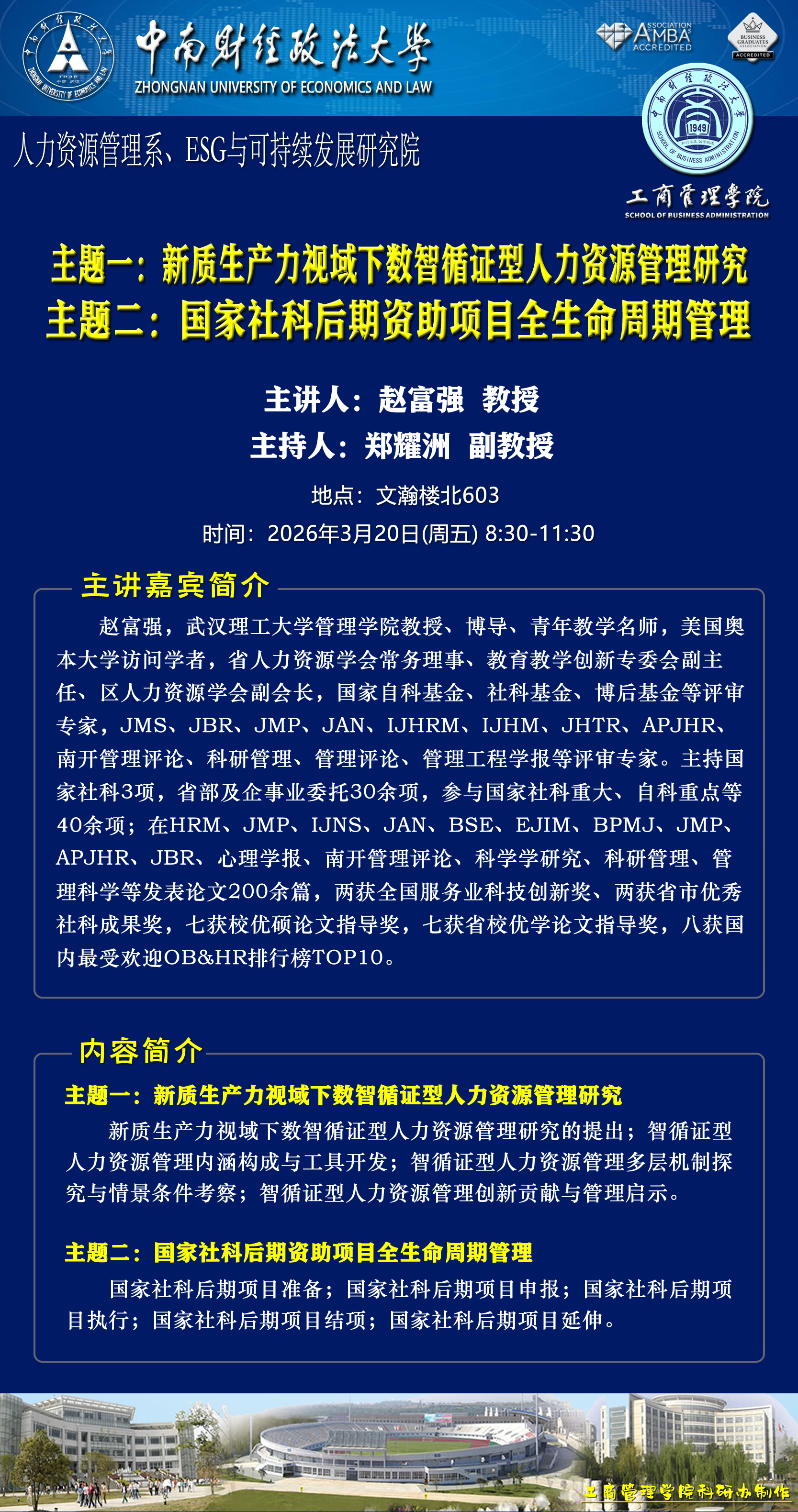 | 2026.03.20 8:30-11:30 | 文瀚楼北603 | 人力资源管理系 ESG与可持续发展研究院 | 郑耀洲 副教授 | 赵富强 教授 | 主题一:新质生产力视域下数智循证型人力资源管理研究 主题二:国家社科后期资助项目全生命周期管理 |
