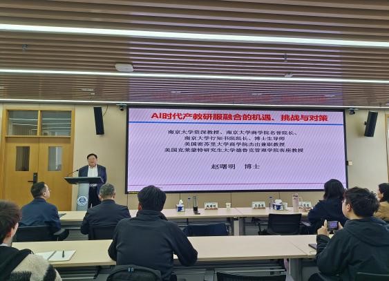 本次讲座以“AI时代产教研服融合的机遇、挑战与对策”为主题。会议伊始,赵曙明教授从当前全球人工智能模型领域的表现以及中国与美国的差距展开探讨,并进行讲座内容的引入。随后,他紧紧围绕当前全球人工智能领域发展现状、存在的差距以及AI赋能产教研服融合的对策展开系统阐述。