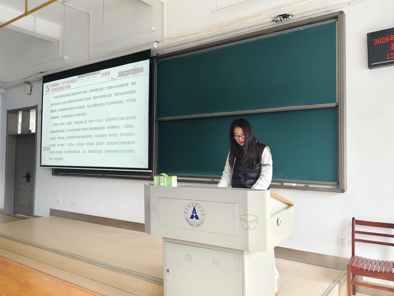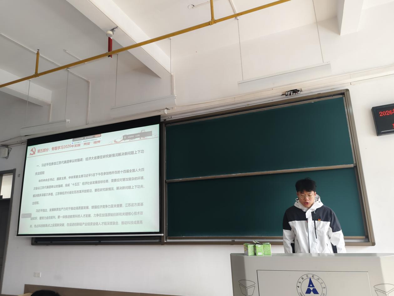 在专题学习2026年全国两会精神环节,郭志鹏同学聚焦习近平总书记参加江苏代表团审议时的重要讲话和李强总理作的政府工作报告,详细解读了“十四五”圆满收官取得的重大成就、2025年我国经济社会发展亮点以及“十五五”开局的重点部署。通过学习,支部成员深刻认识到坚持党中央集中统一领导是应对一切困难的根本保证,进一步增强了奋进新征程的信心和决心。