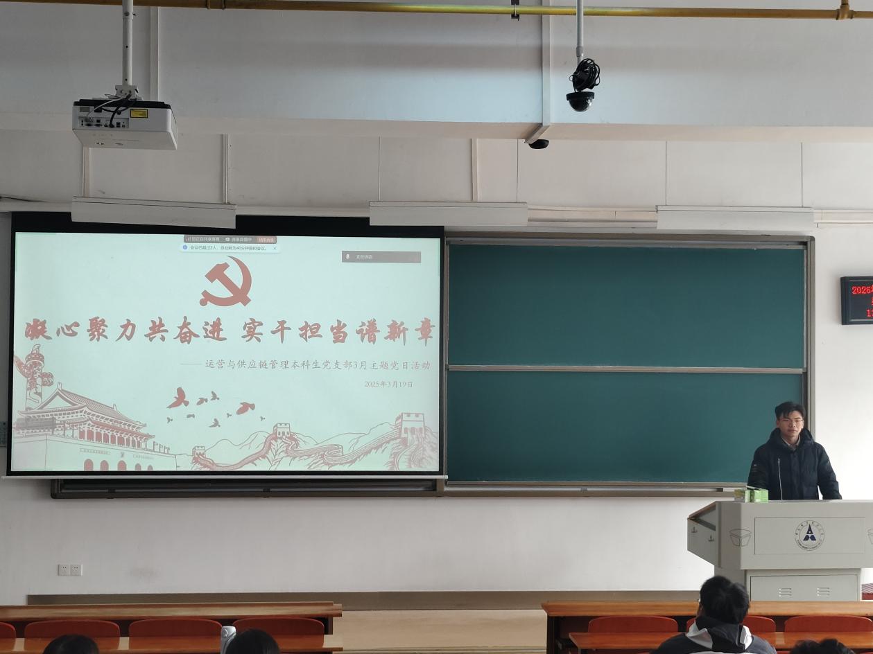 (通讯员 余雯萍 摄影 黄桢淇)为深入学习贯彻党的创新理论,强化纪律意识,践行正确政绩观,凝聚奋进力量,3月19日,运营与供应链管理本科生党支部在南附202开展以“凝心聚力共奋进 实干担当谱新章”为主题的3月党日活动。活动由张福麟同学主持,支部全体党员、入党积极分子参加,通过主题党课、党章领学、讲话精神研读、两会专题学习及支部换届动员等形式,推动理论学习走深走实、见行见效。
