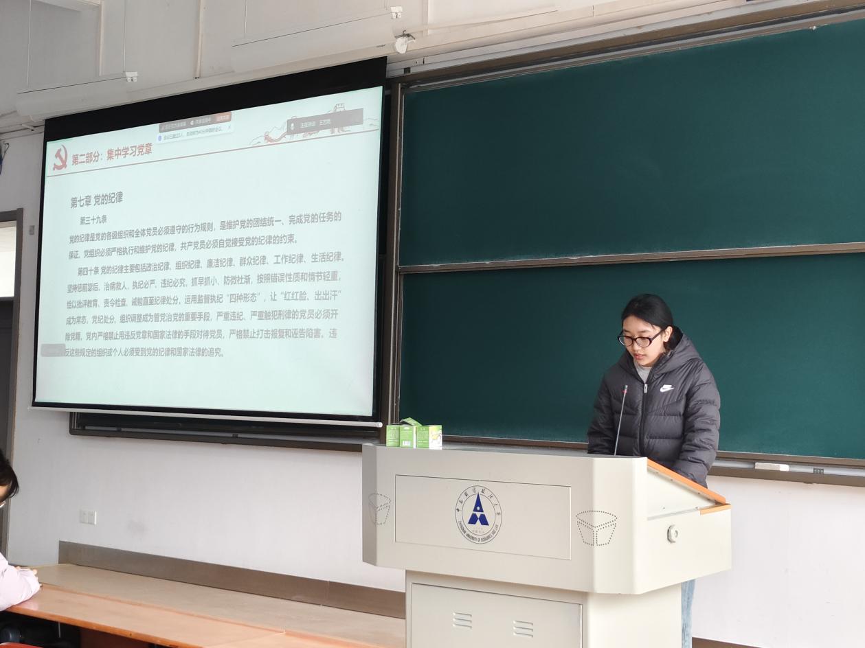 接下来,在集中学习党章环节,泽仁卓玛同学领学了《中国共产党章程》第七章“党的纪律”内容。围绕第三十九条至第四十二条,领学人系统解读了党的纪律的内涵、种类及处分程序,强调党的纪律是维护党的团结统一、完成党的任务的保证,引导支部成员深刻认识严守纪律规矩的重要性,自觉做到心有所畏、言有所戒、行有所止。