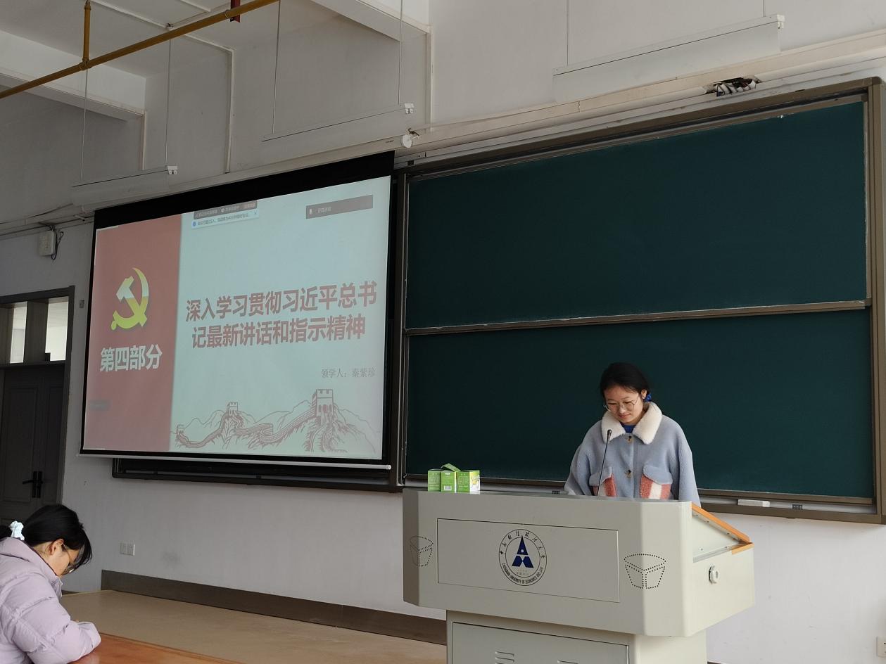 随后,秦紫珍同学带领大家深入学习贯彻习近平总书记最新重要讲话和指示精神。领学人围绕习近平总书记在省部级主要领导干部专题研讨班开班式上的重要讲话精神、中共中央政治局第二十四次集体学习时的重要讲话、对国家自然科学基金委员会工作的重要指示以及参加部分两会代表团审议时的重要讲话展开解读。重点阐释了“十五五”时期经济社会发展的战略部署、发展新质生产力的主攻方向、基础研究的体系化布局以及经济大省在研究新情况解决新问题上的示范作用,帮助支部成员准确把握当前党和国家事业发展的重点任务。