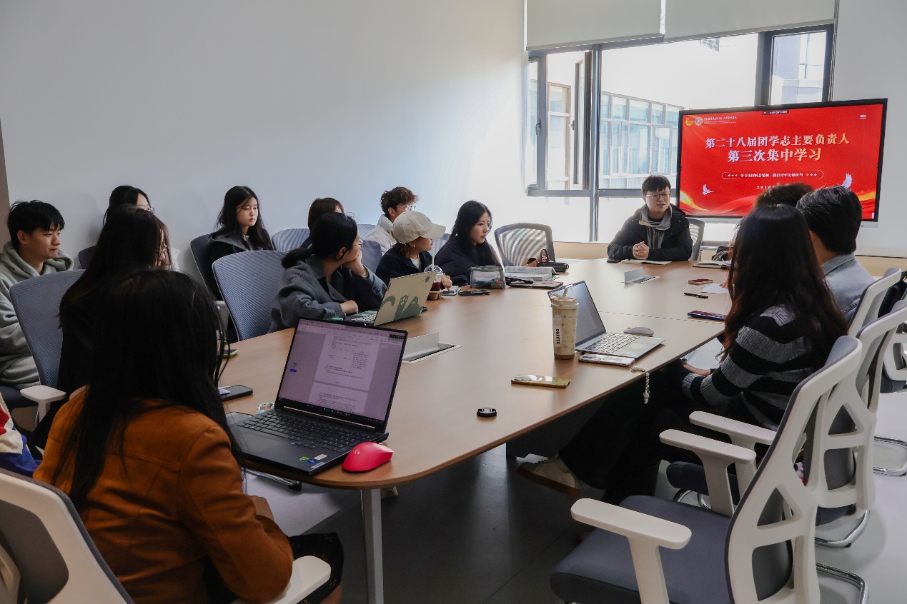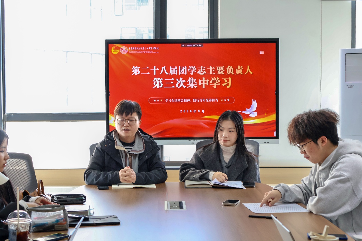 本次集中理论学习由分团委组织部董云天带领团学骨干们深入学习2026年全国两会精神。正值“十五五”规划开局之年,董云天结合“十五五”规划和《政府工作报告》相关内容开展理论学习,指出我国正加快构建全国统一大市场,着力打造智能经济新形态,在教育资源配置与青年人才培养方面不断推进制度创新,同时积极发展文化经济。何强老师对本次理论学习作出指导,他表示,全国两会对个人发展和团学工作具有重要指引作用,鼓励各部门积极组织理论学习。同时,他也提醒大家关注重要时间节点和重大活动,提前部署,提高效率,及时产出工作成果。