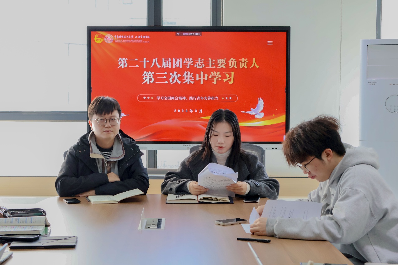 3月12日下午,工商管理学院在文瀚楼进行第十九期“分层次一体化”培训班团学骨干工作例会,第三次集中理论学习2026年全国两会精神。本次会议由分团委书记何强老师主持,团委指导老师潘俊颐出席会议。