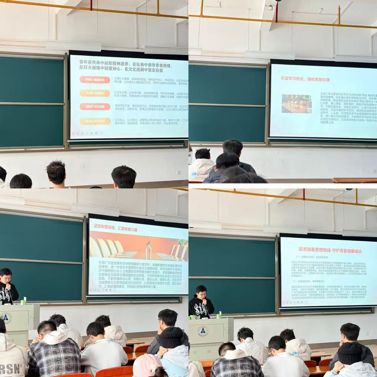理论学习环节,同学们依次开展四大专题学习:禁毒主题学习中,主持人通过案例讲解、知识问答题目,筑牢大家拒毒思想防线;元宵文化学习里,民俗视频、灯谜竞猜等环节让大家深刻感受到传统文化魅力,更加坚定文化自信;冬奥精神学习中,赛事瞬间和健儿的故事给大家展现了拼搏奋进的力量;学习两会精神时,通过观看解读视频、开展主题研讨,大家深化了对国家大政方针的理解,更加坚定制度自信。