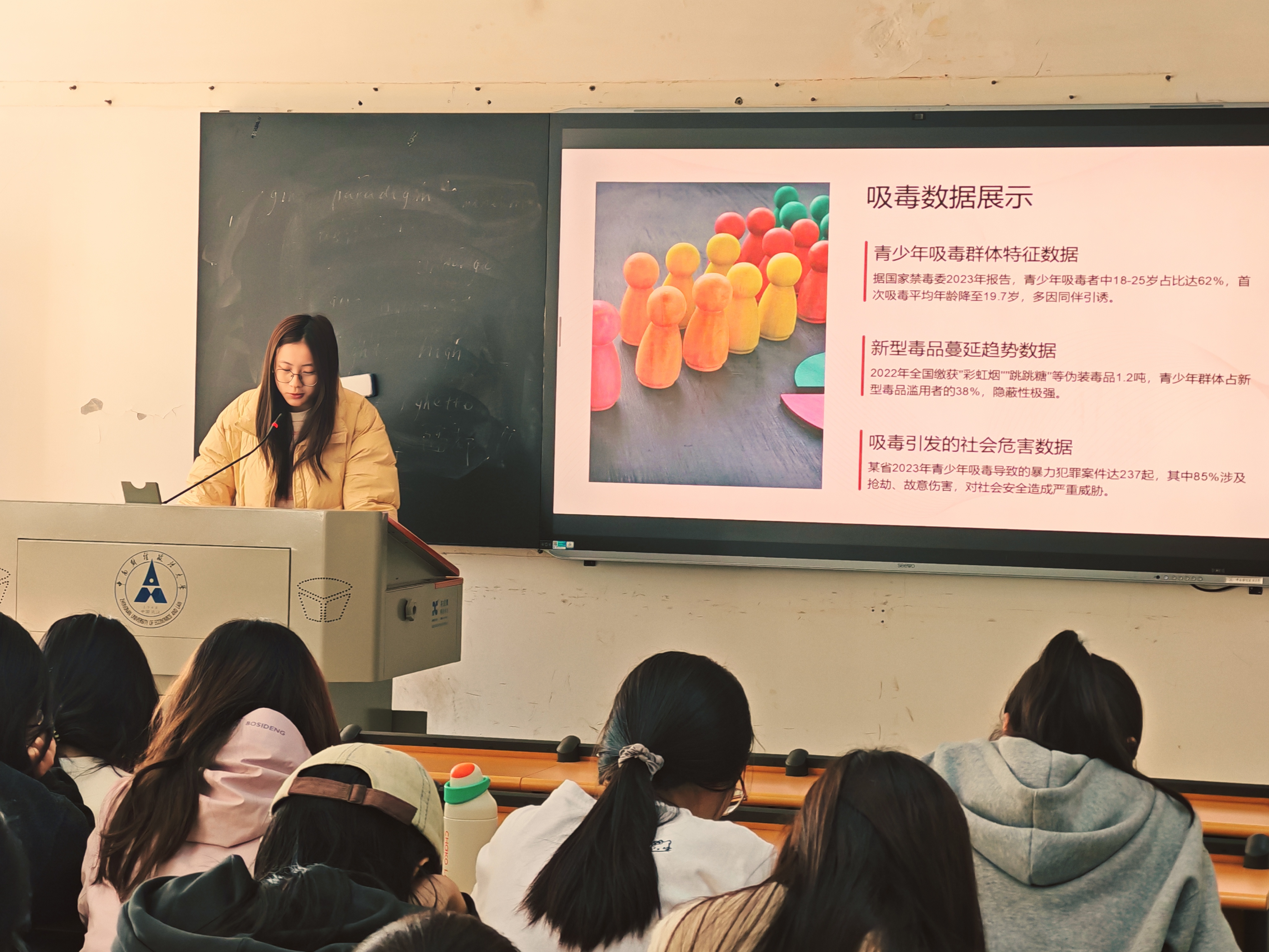 活动第一篇章聚焦“守底线”,支部结合国家禁毒委最新数据,以真实案例和影像资料揭示毒品年轻化、隐蔽化的严峻形势。主持人介绍,青少年吸毒者中18-25岁占比高达62%,新型毒品常伪装成“奶茶包”“跳跳糖”等日常物品,极具迷惑性。通过观看禁毒教育短片、开展禁毒知识问答,同学们深刻认识到吸毒引发的暴力犯罪与家庭悲剧,纷纷表示要守住法律底线,坚决对毒品说“不”,做健康阳光的新时代青年。